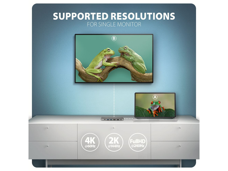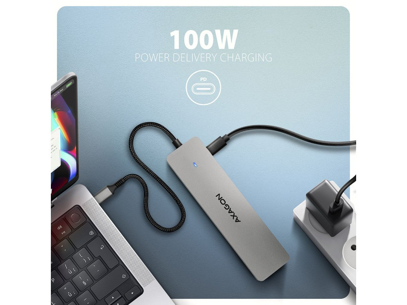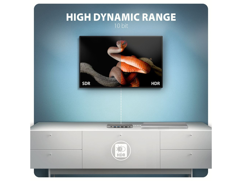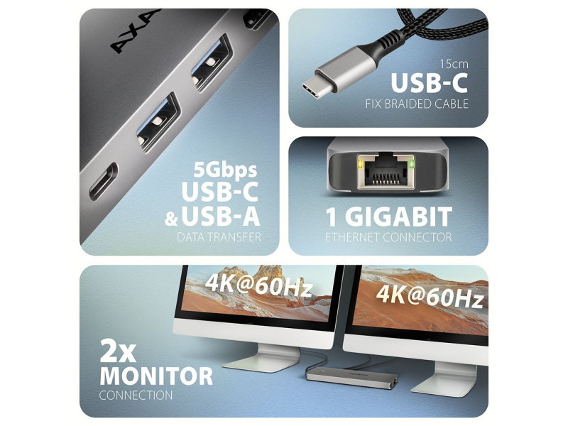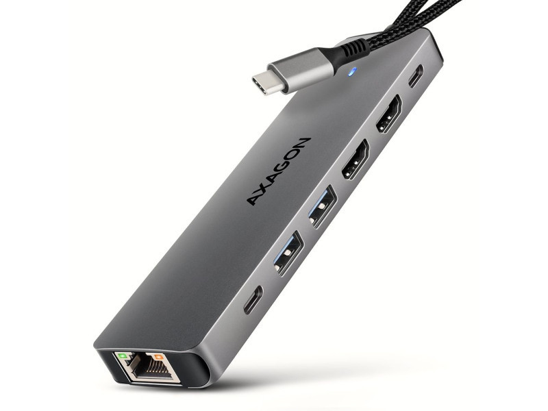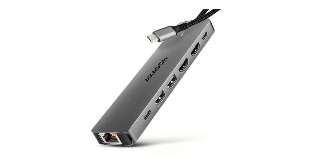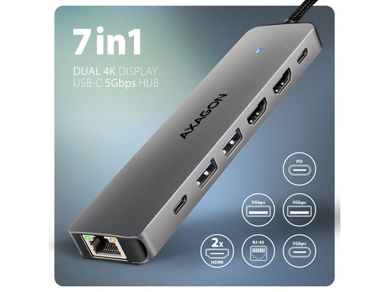 A többportos USB-C 5Gbps AXAGON HMC-7HX2 DUAL 4K DISPLAY 7in1 hub hét porttal bővíti laptopját, számítógépét vagy telefonját. Laptopját 15 cm hosszú USB-C kábelen keresztül csatlakoztatja a hubhoz. Azonnal van csatlakoztatása egy két 4K monitorról, három USB-eszközhöz és egy RJ-45-ös csatlakozóhoz egy Gigabit Ethernet hálózathoz. Lehetőséget kap arra is, hogy a Power Delivery technológiát használó laptopot egyidejűleg táplálja. A portreplikátor így egy univerzális 7in1-ben dokkoló állomás funkcióját tölti be a modern laptopokhoz. Az USB-hub három USB 5Gbps kimenetet kíná, kettő szabványos USB-A, a harmadik pedig USB-C adatcsatlakozóval. A gyors USB 3.2 Gen 1 interfésznek köszönhetően az átviteli sebesség akár 5Gb/s is lehet. Hub egyszerre több külső meghajtót is képes tartósan csatlakoztatni, és lehetővé teszi a laptopok, telefonok és táblagépek akár 1.5A/5V áramerősségű töltését is. A hubról könnyedén tölthet pl. Android okostelefon, Apple iPhone, Apple iPad stb. Egy másik USB-C port a Power Delivery 3.0 technológiát használó laptopok akár 100 W teljesítményű tápellátására és egyidejű töltésére szolgál. Csatlakoztasson egy kompatibilis USB-C Power Delivery töltőt a hubhoz, és csatlakoztassa a hubot egy Power Delivery-t támogató laptophoz. Ez egy USB-C portot takarít meg. A két HDMI-kimenet lehetővé teszi akár 4K/60Hz Ultra HD felbontású külső monitorok, TV-k vagy projektorok csatlakoztatását, még akkor is, ha két monitor van csatlakoztatva egyszerre. Más népszerű felbontások, például 2K/120Hz Quad HD vagy 1080p/240Hz Full HD, valamint a többcsatornás audio streaming is támogatott. A HDR-támogatásnak köszönhetően a színek skáláját korlátozások nélkül élvezheti. A Gigabit hálózati kártya gyors és stabil hálózati kapcsolattal bővíti a számítógépet, hozzáadja a hiányzó RJ-45 hálózati csatlakozót vagy újabb hálózati kártyát. A kompakt alumínium test nemcsak jól néz ki, de mechanikai tartósságot és passzív hűtést is biztosít. Az USB-C hub ideális kiegészítő USB-A csatlakozók nélküli laptopokhoz és video kimeneti. Meglévő USB-perifériái így újak vásárlása nélkül használhatók. A Plug and Play és a Hot Plug funkcióknak köszönhetően maga a hub csatlakoztatása nagyon egyszerű, az nem szükségel bonyolult telepítést és perifériák egyszerűen csatlakoztathatók és leválaszthatók a számítógép működése közben is. A hub megfelelő működéséhez a laptop USB-C portjának támogatnia kell a videokimenetet (DisplayPort Alternate Mode vagy Thunderbolt 3, 4, vagy magasabb) és a Power Delivery tápellátást. A hub könnyen csatlakoztatható telefonokhoz USB-C csatlakozóval. Például csatlakoztathat egy flash meghajtót, billentyűzetet, egeret, képernyőt, televízió vagy kivetítőt a telefonhoz. Bemenet (csatlakozás számítógéphez, táblagéphez vagy telefonhoz): • USB 5Gbps (USB 3.2 Gen 1 / USB 3.0), USB-C male csatlakozó. • Kompatibilní s USB 10Gbps, USB4, Thunderbolt 3/4/5. Bemenet (tápegység): • USB Power Delivery 3.0 - 100W portot, USB-C female csatlakozó. • A notebook tápellátása a hálózati adapterről USB-C hubon keresztül. • A PD tápellátást a laptopnak (tablet, telefonnak) és a hálózati töltőnek is támogatnia kell. Kimenet USB: • 2x USB 5Gbps portot, USB-A female csatlakozó. • 1x USB 5Gbps portot, USB-C female csatlakozó. • Az USB-C hub több külső meghajtó kapcsolatát tudja kezelni egyszerre. • Mobileszközök (beleértve az iPad-et is) töltése legfeljebb 1.5A/5V áramerősséggel a hub USB-A és USB-C portjairól. Videokimenet: • 2x HDMI portot, HDMI A female csatlakozó. Maximálisan támogatott felbontás: • 1 monitor - legfeljebb akár 4K/60Hz Ultra HD, 2K/144Hz Quad HD, 1080p/240Hz Full HD. • 2 monitor - legfeljebb akár 4K/60Hz Ultra HD, 2K/144Hz Quad HD, 1080p/240Hz Full HD. Videó funkciók: • A macOS-t futtató Apple-eszközök esetében a maximális képfrissítési sebesség általában 60Hz-re korlátozódik. • A video kimenetek maximális felbontásának és frekvenciaértékeinek eléréséhez a dokkolót olyan USB-C portra kell csatlakoztatni, amely támogatja a DisplayPort Alternate Mode (DP Alt Mode) min. 1.4-es verzióját, vagy olyan USB-C portra, amely támogatja a min. Thunderbolt 3 szabványt. Megfelelően frissített operációs rendszerre és naprakész grafikus illesztő programokra is szükség van. • HDR támogatás (High Dynamic Range, 10 bites támogatás) – a világos és sötét részletek valósághű reprodukciója. • Támogatás HPD (Hot-Plug-Detect). • Támogatás TMDS (Transition Minimized Differential Signaling). • Teljes HDCP 1.4 a 2.2 támogatás (High-bandwidth Digital Content Protection). • 8csatornás LPCM hang, tömörített audio (AC-3, DTS) és HBR audio formátum támogatás. • A csatornás hang mintavételi frekvencia támogatása 192 kHz-ig és legfeljebb 24 bites hang - a forrástól és a végberendezéstől, azaz a laptop/telefon és a TV/monitor/AV-vevő függvényében. RJ-45 Kimenet: • Ethernet interfész RJ-45 csatlakozóval UTP vagy STP kábeles kapcsolattal. • Támogatott átviteli sebesség az Ethernet interfészhez: 10/100/1000 Mb/s. • Támogatott specifikációk: IEEE 802.3i 10Base-T, IEEE 802.3u 100Base-TX, IEEE 802.3ab 1000Base-T. • 10/100/1000 Mb/s automatikus észlelés. További tulajdonságok: • Lehetőség a készülék csatlakoztatására a Hot Plug támogatásának köszönhetően. • Teljes Plug and Play támogatás. • Támogatás energiatakarékos mód. • Tápellátás USB-buszon keresztül - USB-busz-tápellátás. • Tápellátás PD töltőn keresztül (nem tartozék). • A magas minőségű árnyékolt kábel biztosítja a gyors kommunikációs sebességet, és a minimalizálja a nemkívánatos zajt. • Méret