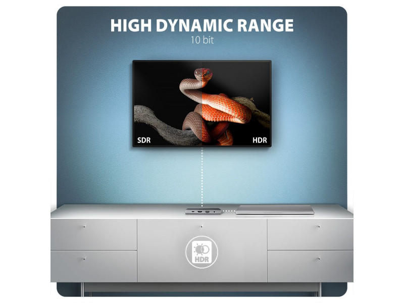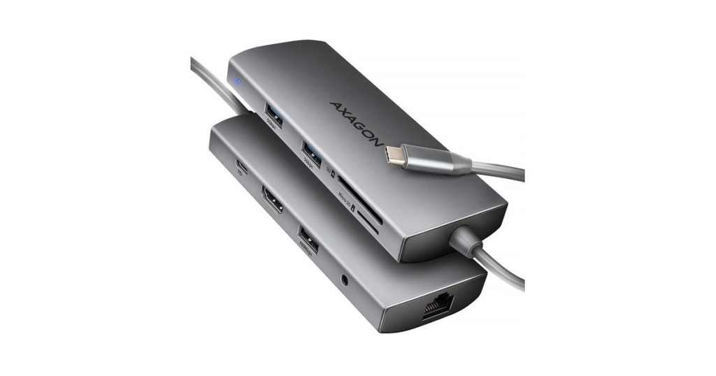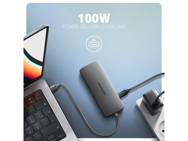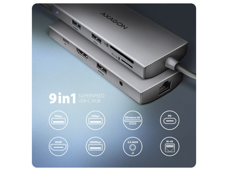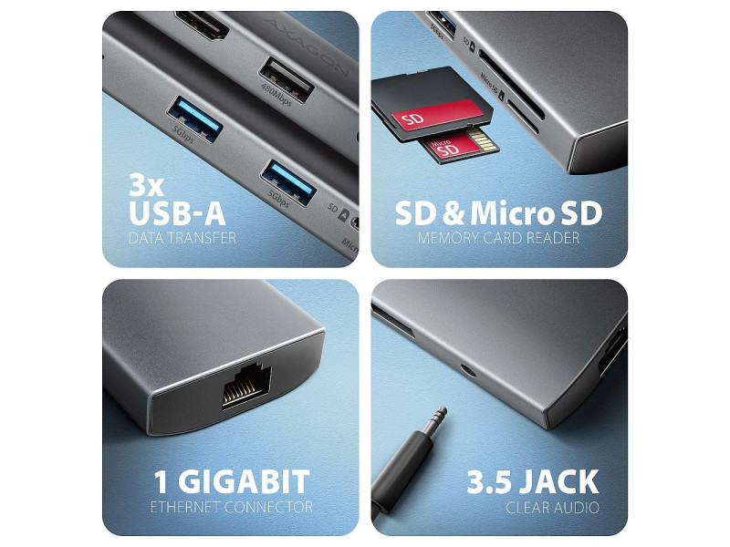 A többportos USB-C 5Gbps AXAGON HMC-8HLSA 9in1 hub kilenc porttal bővíti laptopját, számítógépét vagy telefonját. A kétoldalas USB csatlakozóval egyszerre és gyorsan egy monitort, négy USB-eszközt, Gigabit Ethernet hálózatot, mikrofonos fejhallgató és SD-kártyaolvasót kimenettel csatlakoztathat a számítógépéhez. Lehetőséget kap arra is, hogy a Power Delivery technológiát használó laptopot egyidejűleg táplálja. A csatlakozómásoló így egy egyszerű és kompakt 9 az 1-ben dokkolóállomást biztosít nemcsak Windows laptopokhoz, hanem Apple laptopokhoz, például MacBook Air vagy MacBook Pro készülékekhez is. Az USB-hub három USB-kimenetet kínál szabványos USB-A csatlakozóval. Ebből kettő 5Gbps, egy pedig 480Mbps sebességű egér vagy billentyűzet csatlakoztatásához. A hub több külső meghajtó egyidejű állandó csatlakoztatását is képes kezelni. A gyors USB 3.2 Gen 1 interfésznek köszönhetően az átviteli sebesség akár 5Gb/s is lehet. A második USB-C port a Power Delivery 3.0 technológiát használó laptopok akár 100W teljesítményű tápellátására és egyidejű töltésére szolgál. Csatlakoztasson egy kompatibilis USB-C Power Delivery töltőt a hubhoz, és csatlakoztassa a hubot egy Power Delivery-t támogató laptophoz. Ez egy USB-C portot takarít meg. A HDMI kimenet kiváló minőségű képet biztosít akár 4K/60Hz Ultra HD felbontásig, és támogatja a többcsatornás audioátvitelt. A népszerű játékfelbontások 2K/144Hz vagy FullHD/240Hz magas frekvenciái szintén támogatottak. A HDR (high dynamic range) támogatásnak köszönhetően jelentősen kibővült szín- és kontrasztválasztékot élvezhet korlátozások nélkül. A videokimenet megfelelő működéséhez a laptopodnak rendelkeznie kell DisplayPort Alternate Mode (DP Alt Mode) támogatással rendelkező USB-C porttal vagy legalább Thunderbolt 3, 4 Thunderbolt és újabb. A Gigabit hálózati kártya gyors és stabil hálózati kapcsolattal bővíti a számítógépet, hozzáadja a hiányzó RJ-45 hálózati csatlakozót vagy újabb hálózati kártyát. A kártyaolvasó támogatja az SD és a microSD kártyák összes jelenlegi verzióját, beleértve az SDXC és a microSDXC kapacitását is, legfeljebb 2TB kapacitással. A kártyaolvasó lehetővé teszi a kártyák egyidejű kezelését mindkét foglalatban és a közvetlen másolást közöttük. Az audiokimenet egy 3.5 mm-es jack csatlakozóhoz csatlakozik, és lehetővé teszi a mikrofonos sztereó fejhallgató csatlakoztatását. Az elegáns alumínium ház biztosítja a mechanikai ellenállást és a passzív hűtést is. A Plug and Play és a Hot Plug funkcióknak köszönhetően maga a hub csatlakoztatása nagyon egyszerű, az nem szükségel bonyolult telepítést és perifériák egyszerűen csatlakoztathatók és leválaszthatók a számítógép működése közben is. A hub nem zárkózik el az USB-C csatlakozóval rendelkező telefonokhoz való csatlakoztatástól sem. Például csatlakoztathat egy flash meghajtót, billentyűzetet, egeret, képernyőt, TV-t vagy kivetítőt a telefonhoz. Bemenet (laptop csatlakozás): • USB 5Gbps (USB 3.2 Gen 1 / USB 3.0), USB-C female csatlakozó. • Kompatibilis az USB 3.2 Gen 2, USB4 és Thunderbolt 3/4. Bemenet (tápegység): • USB Power Delivery 3.0 100W portot (csak töltéshez), USB-C female csatlakozó. • A notebook tápellátása a hálózati adapterről USB-C hubon keresztül. • A PD tápellátást a laptopnak (telefonnak) és a hálózati töltőnek is támogatnia kell. Kimenet USB: • 2x USB 5Gbps portot, USB-A female csatlakozó. • 1x USB 480Mbps portot, USB-A female csatlakozó. • Az USB-C hub több külső meghajtó egyidejű csatlakoztatását is képes kezelni. Videó kimenet: • 1x HDMI portot, HDMI A female csatlakozó. • 4K felbontás 4096 x 2160 akár 60 Hz-en. • 2K / WQHD felbontás 2560 x 1440 legfeljebb 120Hz-en. • FHD felbontás 1920 x 1080 akár 240Hz-en. • A fenti maximálisan támogatott felbontások és frekvenciák támogatása a DisplayPort 1.4-es verziójú számítógéphez való csatlakoztatást igényli. • A megfelelő videokimenethez a hubot legalább 1.4-es verziójú DisplayPort Alternate Mode (DP Alt Mode) vagy magasabb verziójú USB-C porthoz vagy Thunderbolt 3/4 támogatással rendelkező USB-C porthoz kell csatlakoztatni. A helyes operációs rendszerre is szükség van. A video kimeneti funkció ezek a követelmények nélkül nem érhető el. • HDR támogatás (nagy dinamikatartomány, 10 bites támogatás) - a világos és sötét részletek valósághű reprodukciója. • Támogatás HPD (Hot-Plug-Detect). • Támogatás TMDS (Transition Minimized Differential Signaling). • Teljes HDCP 1.4 a 2.3 támogatás (High-bandwidth Digital Content Protection). • A 2 csatornás hang mintavételi frekvencia támogatása 192 kHz-ig és legfeljebb 24 bites hang - a forrástól és a végberendezéstől, azaz a laptop/telefon és a TV/monitor/AV-vevő függvényében. RJ-45 Kimenet: • Ethernet interfész RJ-45 csatlakozóval UTP, FTP, STP vagy SFTP patch kábeles kapcsolattal. • Támogatott átviteli sebesség az Ethernet interfészhez: 10/100 /1000 Mb/s. • Támogatott specifikációk: IEEE 802.3 10Base-T, IEEE 802.3u 100Base-TX, IEEE 802.3ab 1000Base-T. • 10/100/1000 Mbit/s automatikus észlelés. • Wake-on-LAN funkció támogatása. Kártyaolvasó - két slot: • Slot Micro SD: microSD / microSDHC / microSDXC / TransFlash. • Slot SD: SecureDigital / SDHC / SDXC, MultiMedia Card, MMC, MMC Dual Voltage, MMC mobile, RS-MMC, miniSD, microSD / microSDHC / microSDXC, MMC Micro adapterrel. • UHS-I támogatás. Akár 104 MB/s sebesség. Támogatja a hardveres ECC funkciót és a CRC funkciót. • 2 LUN – fájlkezelőkben az olvasó két külön lemezként jelenik meg. Ugyanakkor javítja az ergonómiát a munkahelyén. Audio kimenet / bemenet: • 1x 3.5 mm-es c