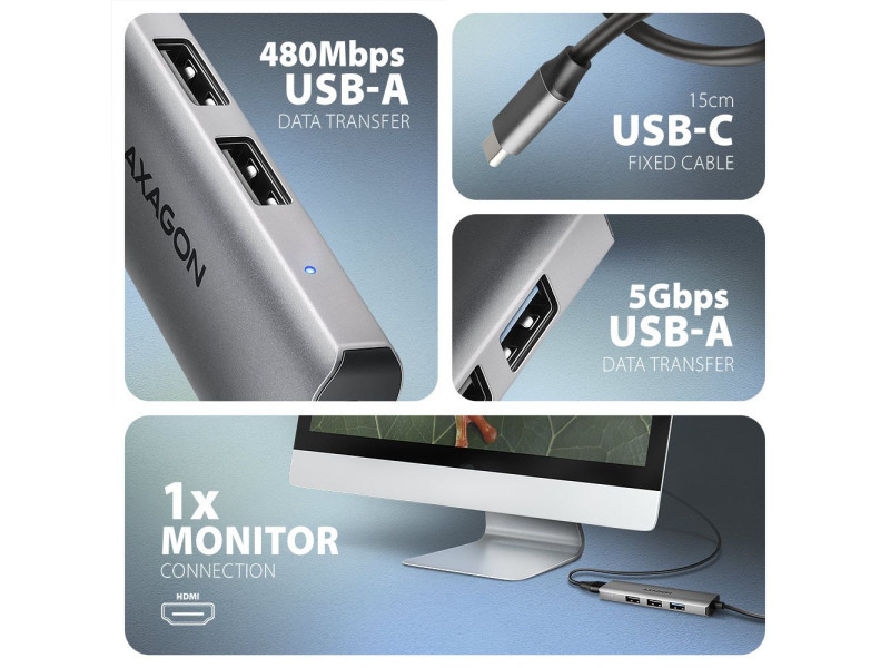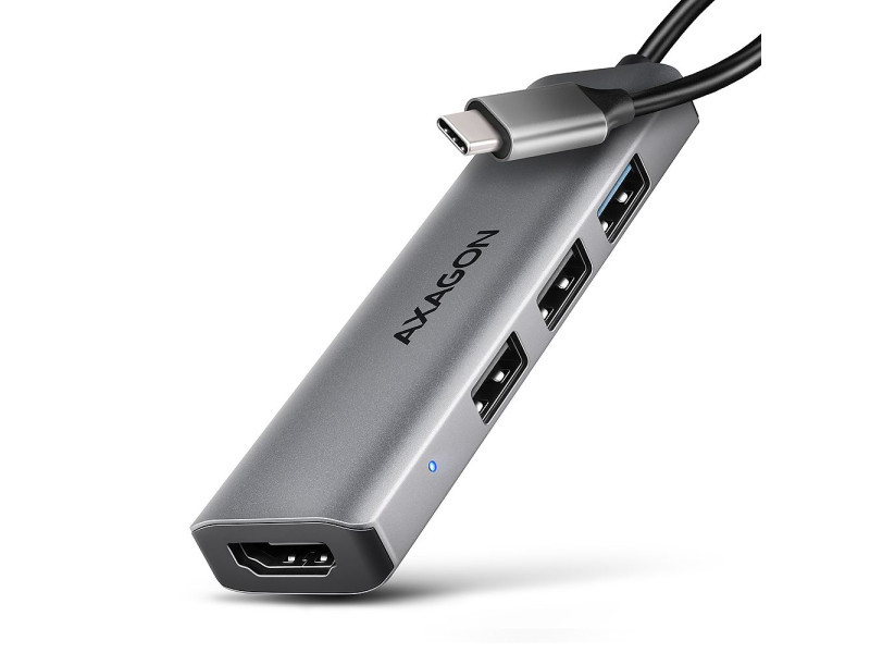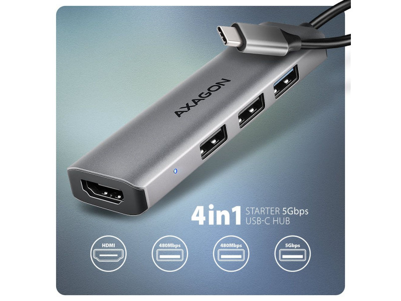 A többportos USB-C 5Gbps AXAGON HMC-H3A STARTER 4in1 hub négy porttal bővíti laptopját, számítógépét telefonját. Laptopját 15 cm hosszú USB-C kábelen keresztül csatlakoztatja a hubhoz. Azonnal csatlakozókkal rendelkezik egy monitor és három USB-eszköz egyidejű csatlakoztatásához. Az USB-elosztó három USB-kimenetet kínál, kettő USB-A 480 Mbps, a harmadik pedig USB-A 5Gbps. A gyors USB 3.2 Gen 1 interfésznek köszönhetően az átviteli sebesség akár 5Gb/s is lehet. Ez a hub több külső meghajtó állandó csat-lakoztatását is kezeli. A HDMI-kimenet lehetővé teszi külső monitor, TV vagy projektor csatlakoztatását akár 4K/30Hz Ultra HD, 2K/60Hz Quad HD vagy 1080p/120Hz Full HD felbontással, valamint többcsatornás hang továbbítását. A kompakt és vékony alumínium test nemcsak jól néz ki, de mechanikai tartósságot és passzív hűtést is biztosít. A finoman strukturált, ujjlenyomatmentes felület szintén kiváló. Az USB-C hub ideális kiegészítő USB-A csatlakozók nélküli laptopokhoz és video kimeneti. Meglévő USB-perifériái így újak vásárlása nélkül használhatók. A Plug and Play és a Hot Plug funkcióknak köszönhetően maga a hub csatlakoztatása nagyon egyszerű, az nem szükségel bonyolult telepítést és perifériák egyszerűen csatlakoztathatók és leválaszthatók a számítógép működése közben is. A hub megfelelő működéséhez a laptop USB-C portjának támogatnia kell a videokimenetet (DisplayPort Alternate Mode vagy Thunderbolt 3, 4 és magasabb). A hub könnyen csatlakoztatható telefonokhoz USB-C csatlakozóval. Például csatlakoztathat egy flash meghajtót, billentyűzetet, egeret, képernyőt, televízió vagy kivetítőt a telefonhoz. Bemenet (csatlakozás számítógéphez, táblagéphez vagy telefonhoz): • USB 5Gbps (USB 3.2 Gen 1 / USB 3.0), USB-C female csatlakozó. • Kompatibilis az USB 10Gbps, USB4, Thunderbolt 3/4. Kimenet USB: • 2x USB 480Mbps portot, USB-A female csatlakozó. • 1x USB 5Gbps portot, USB-A female csatlakozó. • Az USB-C hub több külső meghajtó kapcsolatát tudja kezelni egyszerre. Videokimenetek: • 1x HDMI portot, HDMI A female csatlakozó. Maximálisan támogatott felbontás: • 1 monitor - legfeljebb akár 4K/30Hz Ultra HD, 2K/60Hz Quad HD, 1080p/120Hz Full HD. Videó funkciók: • A macOS-t futtató Apple-eszközök esetében a maximális képfrissítési sebesség általában 60Hz-re korlátozódik. • A videokimeneti funkcióhoz a hubot olyan USB-C porthoz kell csatlakoztatni, amely támogatja a DisplayPort alternatív módot (DP Alt Mode), vagy olyan USB-C porthoz, amely támogatja a min. Thunderbolt 3. Megfelelően frissített operációs rendszerre és naprakész grafikus illesztő programokra is szükség van. • Támogatás HPD (Hot-Plug-Detect). • Támogatás TMDS (Transition Minimized Differential Signaling). • Teljes HDCP 1.4 a 2.3 támogatás (High-bandwidth Digital Content Protection). • Akár 8csatornás LPCM hang, tömörített audio (AC-3, DTC) és HBR audio formátum támogatás. • A csatornás hang mintavételi frekvencia támogatása 192 kHz-ig és legfeljebb 24 bites hang - a forrástól és a végberendezéstől, azaz a laptop/telefon és a TV/monitor/AV-vevő függvényében. További tulajdonságok: • Lehetőség a készülék csatlakoztatására a Hot Plug támogatásának köszönhetően. • Teljes Plug and Play támogatás. • Támogatás energiatakarékos mód. • Tápellátás USB-buszon keresztül - USB-busz-tápellátás. • A LED folyamatos világítással jelzi, hogy a hub csatlakoztatva van a számítógéphez. • A magas minőségű árnyékolt kábel biztosítja a gyors kommunikációs sebességet, és a minimalizálja a nemkívánatos zajt. • Méretei 11 x 95 x 26 mm (H x W x D). • Súly 34 g (kábellel együtt). • USB-C kábel 15 cm hosszú a hub laptophoz való csatlakoztatásához. Támogatott operációs rendszerek: • Windows 10 / 11, macOS, iPadOS, iOS, Linux, Chrome OS és Android. • A kompatibilitás az operációs rendszertől és a gyártó támogatásától függ. • A DisplayPort alternatív mód (DP Alt mód) csak a frissített operációs rendszerben támogatott, valamint az eszköz (laptop, táblagép, telefon) gyártójának támogatásától is függ. • A grafikus kártyaillesztőprogramok is befolyásolhatják a termék megfelelő működését. Javasoljuk, hogy töltse le az illesztőprogramok legújabb verzióját.