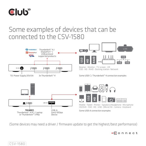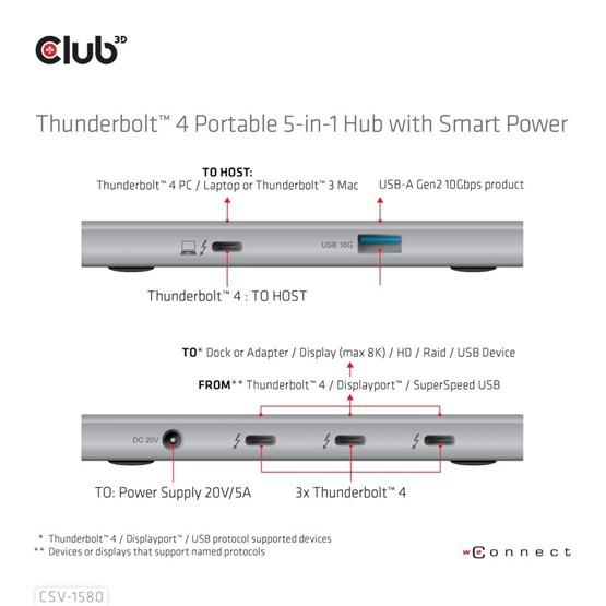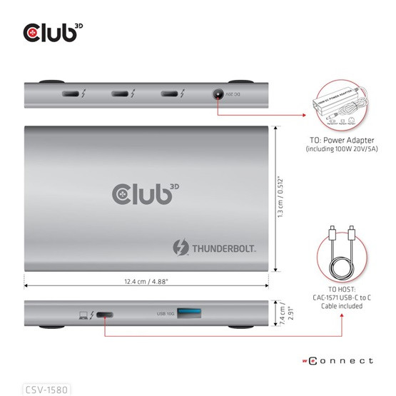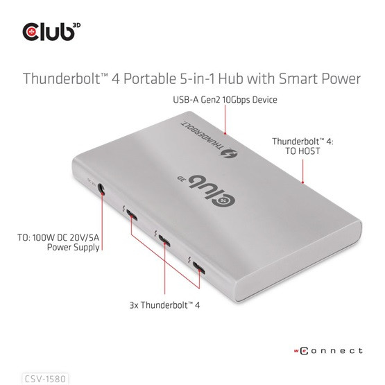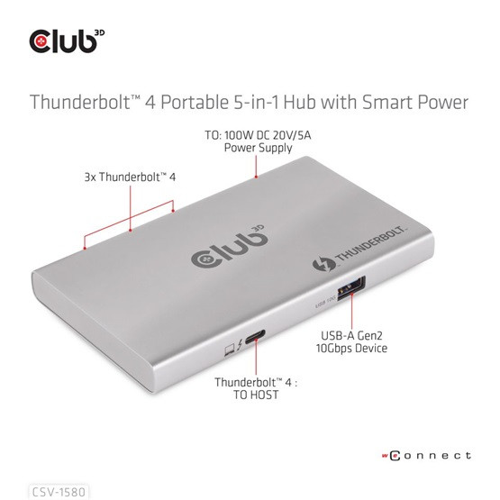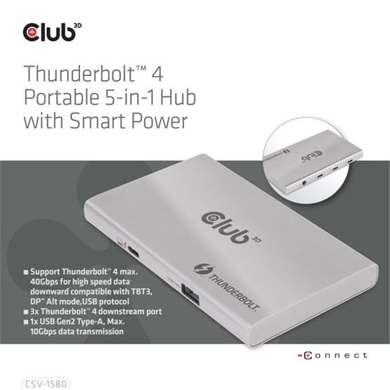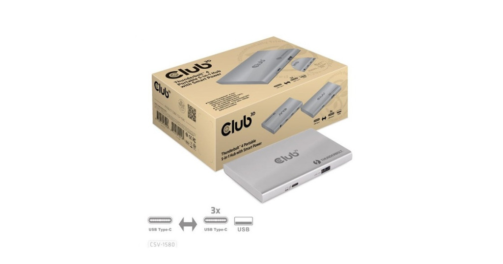 A Club 3D 5 az 1-ben hub segítségével egy notebook vagy PC gyorsan bővíthető számos csatlakozóval. Ez a vékony kialakítású kis doboz összesen három Thunderbolt 4 Type-C portot kínál DisplayPorttal és egy USB 3.1 portot.