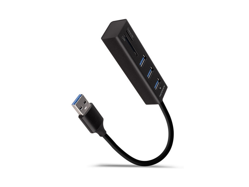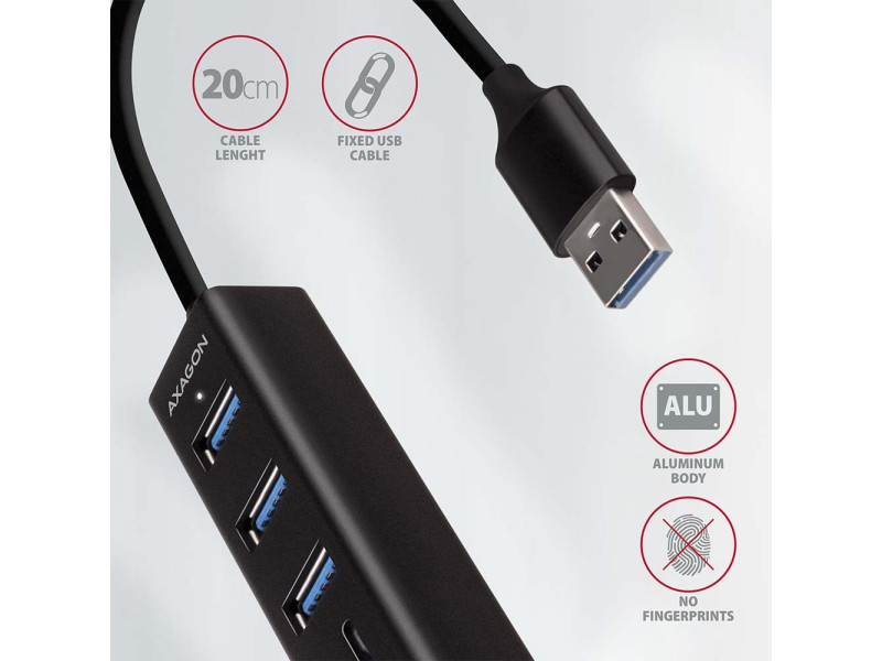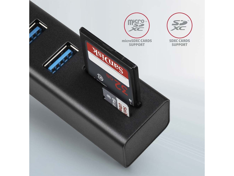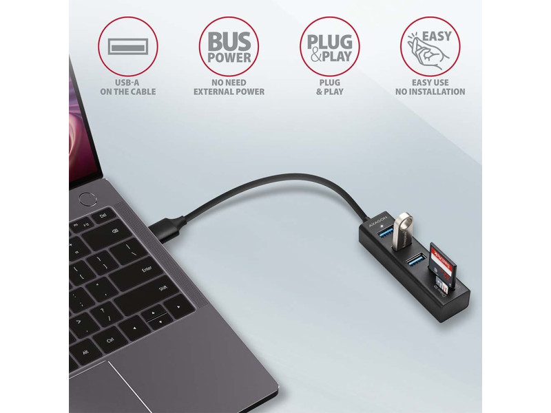 Fém USB 3.2 Gen 1 (USB 3.0) többportos AXAGON HMA-CR3A hub segítségével akár három USB eszközt is csatlakoztathat laptophoz vagy számítógéphez, és SD / microSD kártyaolvasót is hozzáad. A fém hub teste alumíniumból készült és tökéletes mechanikai védelmet nyújt a gyakori hordozáshoz. Elegáns, finom felület az ujjlenyomatok ellen. A gumipárnák megakadályozzák, hogy lecsússzanak az asztalról. A tartósan rögzített 20 cm hosszú USB-kábel ideális a mobil eszközök felhasználói számára. Ez a kompakt többportos hub több külső meghajtó állandó csatlakoztatását is kezeli. A gyors USB 3.2 Gen 1 interfésznek köszönhetően az átviteli sebesség akár 5Gb/s is lehet. A hub emellett 1,5A/5V árammal működő telefonokat és táblagépeket is tölt. Tehát a hub könnyen tölthet Android-okostelefont, Apple iPhone-t, Apple iPad-et és más készülékeket is. A kártyaolvasó támogatja az SD és a microSD kártyák összes jelenlegi verzióját, beleértve az SDXC és a microSDXC kapacitását is, legfeljebb 2TB kapacitással. Nagy adatátviteli sebességet biztosít az USB 3.2 Gen 1 interfész. A kártyaolvasó lehetővé teszi a kártyák egyidejű kezelését mindkét foglalatban és a közvetlen másolást közöttük. A több portos USB hub ideális kiegészítő ultrabookokhoz, melyek kis számú USB-A porttal és hálózati kártya nélkül kaphatók. A hubnak nem gond az sem, hogy a megfelelő OTG vagy USB-A > USB-C adapterrel csatlakozik a telefonokhoz. Csatlakoztathat egy flash meghajtót, billentyűzetet és egeret telefonjához vagy táblagépéhez. Műszaki leírás Bemenet: 1x USB 3.2 Gen 1 / SuperSpeed USB portot, USB-A male csatlakozó. Visszafelé kompatibilis az USB 3.1 Gen 1 / USB 3.0 / USB 2.0 és USB 1.1. USB-A male (apa) típusú csatlakozó 20 cm hosszú, fixen a kábelhez rögzített. USB Kimenet: 3x SuperSpeed USB portot, USB-A female csatlakozó. Támogatja a következő átviteli sebességeket 5.000 / 480 / 12 / 1.5 Mb/s (SuperSpeed / High / Full / Low speed). Az állomás teljes áteresztőképessége / átviteli sebessége az alkalmazott USB 3.2 Gen 1 interfész függvénye (elméletileg 5 Gbit/s). Az USB hub több külső meghajtó kapcsolatát tudja kezelni egyszerre. Kártyaolvasó - két slot, a következő formátumokat támogatja: slot Micro SD: microSD / microSDHC / microSDXC / TransFlash, slot SD: SecureDigital / SDHC / SDXC, MultiMedia Card, MMC 4.0, MMC Dual Voltage, MMC mobile, RS-MMC, miniSD, microSD / microSDHC / microSDXC, MMC Micro adapterrel. Az olvasó az alábbi flash kártya specifikációkat támogatja: SD 1.0/1.1 (SD - Secure Digital, max. 2GB). SD 2.0 (SDHC - Secure Digital High Capacity, akár 32GB). SD 3.0 (SDXC - Secure Digital eXtended Capacity, akár 2TB). MMC a eMMC 3.x / 4.0 / 4.1 / 4.2 / 4.3 / 4.4 / 4.5 / 5.0 (8-bit). SD 3.01 és SD Jukebox alkalmazás támogatás (CPRM funkció). Ultra High Speed bus UHS-I (SDR12/SDR25/SDR50/DDR50/SDR104) támogatás, sebesség akár 104 MB/s. ECC (Error Correction Code) hardvertámogatás funkció és CRC (Cyclic Redundancy Check) funkció. 2 LUN - a fájlkezelőkben az olvasó egyetlen lemezegységként jelenik meg. FAT 12/16/32, NTFS, exFAT (FAT 64) fájlformátum támogatás. További adatok: Lehetőség a készülék csatlakoztatására a Hot Plug támogatásának köszönhetően. Teljes Plug and Play támogatás. Támogatás energiatakarékos mód. A magas minőségű árnyékolt kábel biztosítja a gyors kommunikációs sebességet, és a minimalizálja a nemkívánatos zajt. A fehér LED a számítógép USB portjához való csatlakozást jelzi. Tápellátás USB-buszon keresztül (USB-busz-tápellátás). Méretek 84 x 24 x 18 mm. Súly 42 g (kábellel együtt). 20 cm-es USB kábel. Tápellátás / Töltés: Az USB tápellátás elegendő ahhoz, hogy mind a négy porthoz alacsony energiafogyasztású USB-eszközöket (egér, billentyűzet, kártyaolvasó, flash meghajtó stb.) vagy önálló tápellátással rendelkező készülék (nyomtató, szkenner, 3.5" külső meghajtó) csatlakozzon. Az USB hub több külső meghajtó kapcsolatát tudja kezelni egyszerre. Töltsön mobileszközöket (beleértve iPad-et is) 1.5A-ig terjedő árammal az egyes hub-portokban. A teljes töltési áram (amely portokra van osztva) 5V-nál eléri a 2.8A-t (a számítógép USB-portjának képességeitől függően). Támogatott operációs rendszerek: MS Windows XP / Vista / 7 / 8 / 8.1 / 10 és újabb, Windows Server 2003 / 2008 / 2012 / 2016 és újabb (támogatott az összes 32- és 64-bites Windows operációs rendszer), Mac OS X 10.4.x és magasabb, Linux 2.6.x és magasabb, minden Android verzió. Megj.: A meghajtók a támogatott operációs rendszerek részét képezik, és a telepítésük teljesen automatikus. Nincs szükség más drivert telepíteni, és el sem érhetők. A csomagolás tartalma: SuperSpeed USB multi port hub rögzített 20 cm-es kábellel, nyomtatott telepítési kézikönyv CZ / DE / DK / ENG / ESP / FIN / FR / GR / HR / HU / IT / NL / PL / PT / RO / RU / SK / SWE / BG / CN / TR / ARA, bolti állványra akasztáshoz nyílással ellátott.
