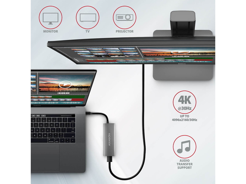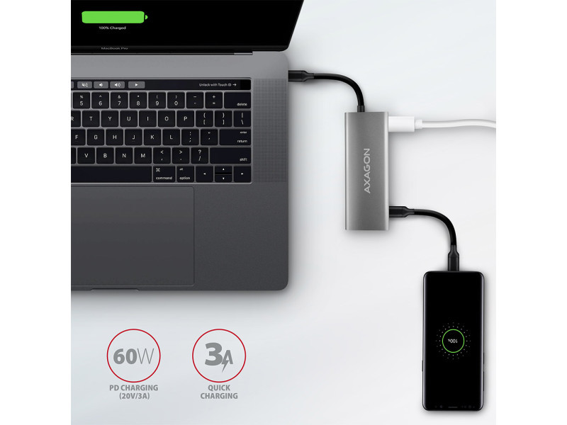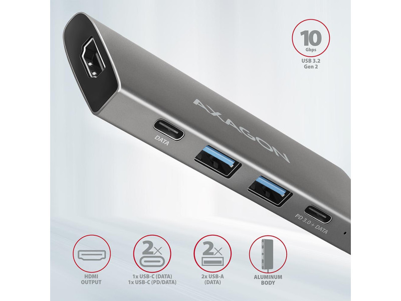 Bemenet: • 1x USB 3.2 Gen 2 / SuperSpeed USB 10 Gbps port, USB-C male csatlakozó. • Visszafelé kompatibilis az USB 3.2 Gen 1 / USB 3.1 Gen 1 / USB 3.0 és USB 2.0 szabványokkal. • Kompatibilis a Thunderbolt 3-mal. • USB type C apa csatlakozó bemenete rögzített 13 cm-es kábelen. USB kimenetek: • 2x SuperSpeed USB 10 Gbps port, USB-A female csatlakozó. • 1x SuperSpeed USB 10 Gbps port, USB-C female csatlakozó. • 1x SuperSpeed USB 10 Gbps port adatátvitelhez vagy Power Delivery töltéshez, USB-C female csatlakozó. • Támogatja a következő átviteli sebességeket: 10.000 / 5.000 / 480 / 12 / 1.5 Mb/s (SuperSpeed+ / SuperSpeed / High / Full / Low speed). • A tok teljes sávszélességét / átviteli sebességét az alkalmazott USB 3.2 Gen 2 interfész határozza meg (elméletileg akár 10 Gbit/s). • Az USB-C hub egyszerre több külső meghajtó csatlakoztatását is képes kezelni. • Nagy teljesítményű mobileszköz-töltés az USB-C portokon akár 3A áramerősséggel. HDMI kimenet: • HDMI. • HDMI A (F) anya csatlakozó. • Maximális támogatott felbontás 4K / 4096 x 2160 30 Hz-en. • A videó kimenet megfelelő működéséhez DisplayPort alternatív mód (DP Alt mód) USB-C port vagy Thunderbolt 3 port szükséges. A helyes operációs rendszer is szükséges. A videokimeneti funkció ezen követelmények nélkül nem lesz elérhető. • HPD (Hot-Plug-Detect) támogatás. • TMDS (Transition Minimized Differential Signaling) támogatás. • HDCP 1.4 és 2.3 (High-bandwidth Digital Content Protection) támogatás. • Akár 8 csatornás LPCM audio, tömörített audio (AC-3, DTC) és HBR audio formátum támogatás. • Mintavételi frekvencia 192 kHz-ig és 24 bites audio támogatás - függ a forrástól és a céleszköztől, azaz notebooktól / telefontól és TV-től / kijelzőtől / AV vevőtől. Power Delivery: • Power Delivery 3.0 támogatás – a készülék tápellátása a PD fali töltőről USB-C hubon keresztül. • Maximális tápellátás PD USB-C hub kimeneten keresztül 60W - 20V / 3A. • Notebook vagy telefon Power Delivery töltési támogatással az USB-C portról és megfelelő PD töltővel szükséges. Egyéb jellemzők: • Lehetőség a készülék csatlakoztatására működés közben a Hot Plug támogatásnak köszönhetően. • Teljes Plug and Play támogatás. • Készenléti üzemmód támogatása. • Tápellátás USB buszon keresztül - USB busz tápellátás vagy PD fali töltő. • Nagy teherbírású alumínium test a jobb agyhűtés érdekében. A magasabb felületi hub hőmérséklet nem jelent problémát - a hub működése által termelt hő jobban eloszlik és átadódik a környezetnek. • A kék LED jelzi a számítógép USB-portjának csatlakoztatását (állandó fény) vagy a Power Delivery töltőhöz való csatlakozást (erősebb fény) • A kiváló minőségű árnyékolt kábel gyors kommunikációs sebességet és minimális nem kívánt interferenciát biztosít. • Méretek: 105 x 40 x 12 mm. • Súly: 60 g (kábellel együtt). • USB kábel hossza 13 cm. Támogatott operációs rendszerek: • Microsoft Windows 10, Mac OS, Linux, Android és Chrome OS. A kompatibilitás a használt operációs rendszertől és az eszköz gyártójának támogatásától függ. • Megjegyzés 1: Az illesztőprogramok a támogatott operációs rendszerek részét képezik, és automatikusan települnek. Nincs szükség más illesztőprogramok telepítésére. • Megjegyzés 2: A DisplayPort alternatív mód (DP Alt mód) csak frissített operációs rendszeren támogatott, és az eszköz (notebook, telefon) gyártójának támogatásától is függ. A csomag tartalma: • USB-C hub rögzített 13 cm hosszú kábellel, • nyomtatott telepítési útmutató CZ / DE / DK / ENG / ESP / FIN / FR / GR / HR / HU / IT / NL / PL / PT / RO / RU / SK / SWE / BG / CN / TR / ARA nyelven,