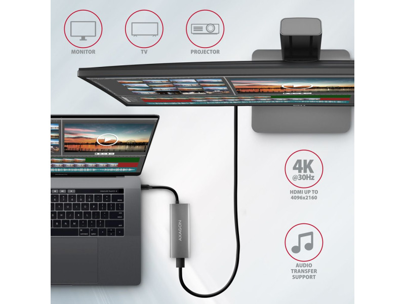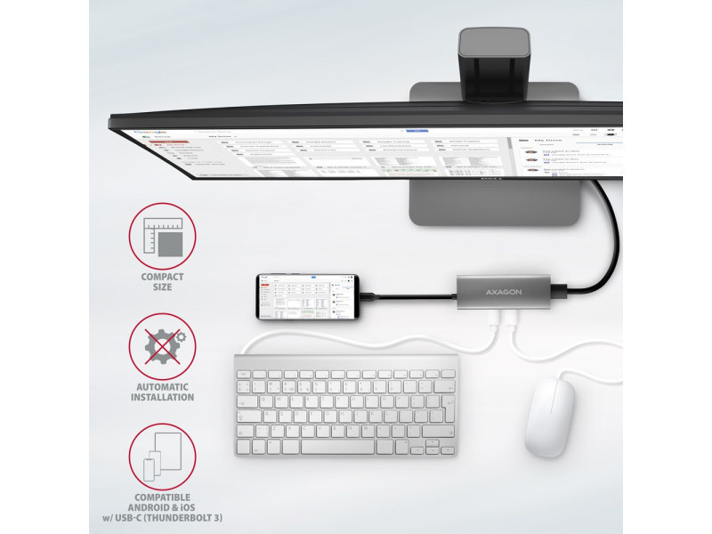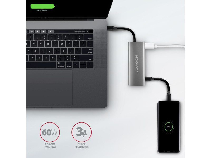 A többportos USB-C 10Gbps AXAGON HMC-5G21 SPEEDSTER 5in1 hub öt porttal bővíti laptopját, számítógépét vagy telefonját. A csatlakozás 13 cm-es USB-C kábelen keresztül történik. Így azonnal elérhetővé válik egy 4K monitor és más USB perifériák csatlakoztatása. Ezzel egyidejűleg lehetőség van a laptop Power Delivery technológián keresztüli töltésére is. A Thunderbolt 3/4/5 kompatibilitásnak köszönhetően egyszerű és kompakt dokkolóállomásként is használható például Apple MacBook Air vagy Pro készülékhez. Két darab 10Gbps sebességű USB-A kimenet lehetővé teszi külső merevlemezek, pendrive-ok, egér, nyomtató és más USB eszközök csatlakoztatását. A portok mobiltelefonokat és táblagépeket is töltenek akár 1.5A áramerősséggel. A hub egy kombinált USB-C porttal is rendelkezik, amely adatátvitelre (USB 10Gbps), vagy laptop töltésére használható Power Delivery töltővel. Megfelelő PD töltő használatával akár 60W teljesítménnyel tölthető a laptop és a hub is a Power Delivery 3.0 technológia révén. A HDMI kimenet lehetővé teszi külső monitor, TV vagy projektor csatlakoztatását akár 4K/30Hz Ultra HD, 2K/60Hz Quad HD vagy 1080p/120Hz Full HD felbontással, valamint többcsatornás hangátvitellel. A videó kimenet megfelelő működéséhez a laptopnak rendelkeznie kell DisplayPort Alternate Mode (DP Alt Mode) vagy Thunderbolt 3 vagy magasabb porttal. A kompakt és vékony alumíniumház nemcsak jól néz ki, de mechanikai tartósságot és passzív hűtést is biztosít. A finoman textúrázott felület nem hagy ujjlenyomatokat. Az USB-C hub ideális kiegészítő olyan laptopokhoz, amelyek nem rendelkeznek USB-A porttal vagy videokimenettel. Így a meglévő USB perifériáit továbbra is használhatja új eszközök vásárlása nélkül. A Plug and Play és Hot Plug funkcióknak köszönhetően a hub csatlakoztatása egyszerű, nem igényel bonyolult telepítést, és a perifériák csatlakoztatása és leválasztása a számítógép működése közben is lehetséges. A hub mobiltelefonhoz is csatlakoztatható USB-C csatlakozóval, például pendrive, billentyűzet, egér, monitor, TV vagy projektor kapcsolásához. Bemenet (laptophoz csatlakozás): • USB 10Gbps (USB 3.2 Gen 2), USB-C female csatlakozó. • Kompatibilis az USB 3.2 Gen 1, USB4 és Thunderbolt 3/4/5. Bemenet (tápellátás): • USB Power Delivery 3.0 – 60W port, USB-C female. • Laptop töltése fali adapteren keresztül az USB-C hubon át. • A PD tápegység támogatása szükséges mind a laptop, mind a töltő oldaláról. USB kimenetek: • 2× USB 10Gbps port, USB-A female csatlakozó. • 1× USB 10Gbps port, USB-C female csatlakozó. • 1× USB 10Gbps port adatátvitelre vagy Power Delivery töltésre, USB-C female csatlakozó. • Az USB-C hub több külső meghajtó kapcsolatát tudja kezelni egyszerre. HDMI kimenet: • 1× HDMI port, HDMI A female csatlakozó. • 4K / UHD felbontás 4096 ×2 160 max. 30Hz. • 2K / QHD felbontás 2560 × 1440 max. 60Hz. • 1080p / F HD felbontás 1920 × 1 080 max. 120Hz. • A fent említett maximális felbontások és frekvenciák támogatása DisplayPort 1.4 verziójú számítógéphez szükséges. • A videokimeneti funkció használatához a hubot olyan USB-C porthoz kell csatlakoztatni, amely támogatja a DisplayPort Alternate Mode-ot (DP Alt Mode), vagy olyan USB-C porthoz, amely támogatja a Thunderbolt 3/4/5 szabványt. Emellett megfelelő operációs rendszer is szükséges. E támogatás hiányában a videokimeneti funkció nem fog működni. • Támogatás: HPD (Hot-Plug-Detect). • Támogatás: TMDS (Transition Minimized Differential Signaling). • Teljes HDCP 1.4 és 2.2 (High-bandwidth Digital Content Protection) támogatás. • 8 csatornás LPCM hang támogatása. • Mintavételezési frekvencia támogatás: max. 192kHz és 24 bit – a forrás- és céleszköztől függően (pl. notebook/telefon és TV/monitor/AV-vevő). További tulajdonságok: • Lehetőség a készülék csatlakoztatására a Hot Plug támogatásának köszönhetően. • Teljes Plug and Play támogatás. • Energiatakarékos mód támogatása. • Tápellátás USB-buszon keresztül – USB bus power vagy PD töltőn keresztül. • Strapabíró alumíniumház a jobb hűtésért. • Kék LED jelzi a kapcsolatot a számítógéppel folyamatos fény vagy a PD töltőhöz erősebb fény. • A magas minőségű árnyékolt kábel biztosítja a gyors kommunikációs sebességet, és a minimalizálja a nemkívánatos zajt. • Méretek 105 × 40 × 12 mm. • Tömeg 60 g (kábellel együtt). • USB kábel hossza 13 cm. Műszaki adatok Bemenet Interfész: USB 3.2 Gen 2 / USB 3.2 Gen 1 / USB 3.0 / USB 2.0 Interfész: USB-C (DisplayPort Alternate Mode) Sebesség: 10.000 / 5.000 / 480 Mbit/s (super+ / super / high speed) Csatlakozó: USB Type C apa csatlakozó (a kábelen) Kábel: 13 cm Kimenet Interfész: USB 3.2 Gen 2 Interfész: HDMI Portok száma: 5 Kimeneti feszültség: 60W – 20V/3A Csatlakozó: USB-A 2× Csatlakozó: USB-C 2× Csatlakozó: HDMI A anya csatlakozó Támogatott tulajdonságok Gyors töltés: 3A USB Power Delivery: Igen Túltöltés elleni védelem: Igen Max. felbontás: 4096 × 2160 @30Hz (4K x 2K) Megjelenítési módok: Az elsődleges kijelző tükrözése / kiterjesztése Hang továbbítás: Igen Automatikus telepítés: Igen Hot Plug Detect: Igen (HPD – eszköz csatlakoztatás / lecsatlakoztatás működés közben) Plug and Play: Igen Hot Plug: Igen Egyéb tulajdonságok Jelzés: 1 LED Méretek: 105 × 40 × 12 mm Súly: 60 g Áramellátás A buszon: USB bus power Tápkábel keresztül: Power Delivery OS támogatás MS Windows: 10 / 11 és újabb Mac OS: Igen Android: Igen Chrome: Igen