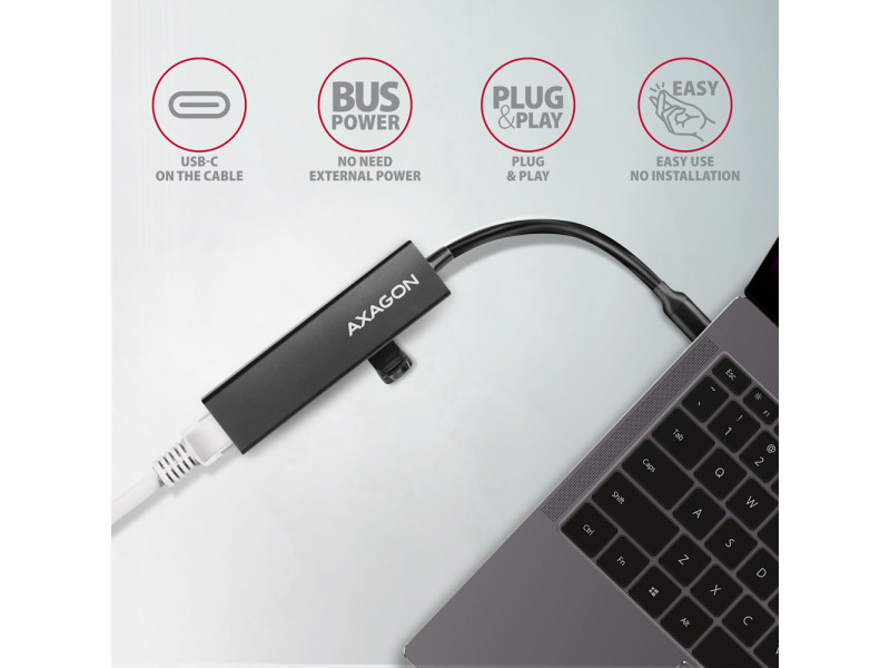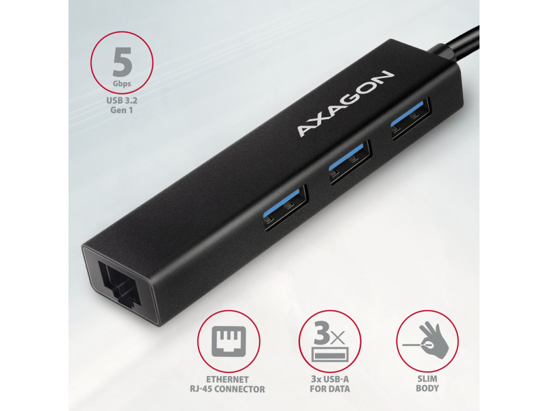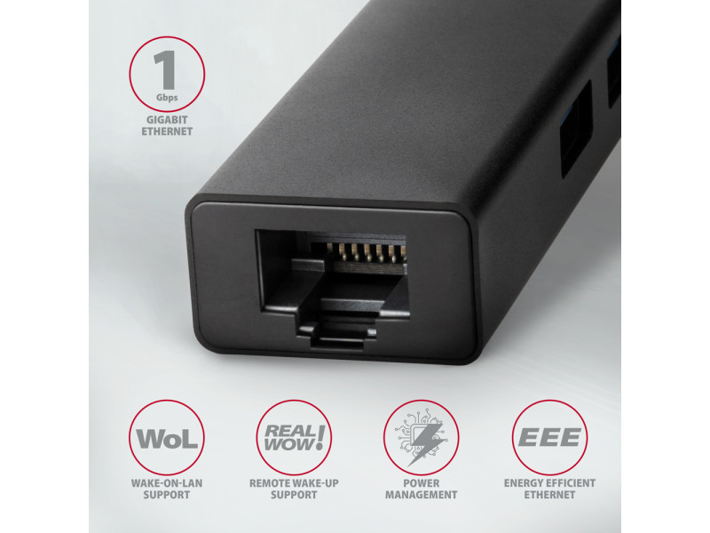 Az AXAGON HMC-GL3A vékony fémből készült USB-C 3.2 Gen 1 (USB 3.0) többportos elosztó akár három USB-eszközt csatlakoztathat laptophoz vagy számítógéphez, és hozzáad egy Gigabit hálózati kártyát, amely összeköti a számítógépet a nagy sebességű hálózattal. A fém hub teste alumíniumból készült és tökéletes mechanikai védelmet nyújt a gyakori hordozáshoz. Elegáns, finom felület az ujjlenyomatok ellen. A tartósan rögzített 20 cm hosszú USB-kábel ideális a mobil eszközök felhasználói számára. Ez a kompakt többportos hub több külső meghajtó állandó csatlakoztatását is kezeli. A gyors USB 3.2 Gen 1 interfésznek köszönhetően az átviteli sebesség akár 5 Gb/s. A Gigabit hálózati adaptergyors és stabil hálózati kapcsolattal bővíti a számítógépet, hozzáadja a hiányzó RJ-45 hálózati csatlakozót vagy újabb hálózati kártyát. A LAN adapter kompatibilis a 10/100/1000 Mbit/s sebességgel, és számos funkciót kínál, mint például az IPv4/IPv6 ellenőrző összeg a CPU terhelésének csökkentése érdekében az ellenőrző összegekkel, a keresztezés észlelése és automatikus korrekciója, a TCP nagy küldési terhelése, a Wake-on-LAN különféle módjainak támogatása, munka a virtuális LAN-nal (VLAN) és a fejlett energiagazdálkodási szolgáltatásokkal. A Windows 8.1-től minden újabb modern operációs rendszerben az adapter egyszerű automatikus telepítést tesz lehetővé internetkapcsolat nélkül. A port replikátor ideális kiegészítő ultrabookokhoz, melyek kis számú USB-A porttal és hálózati kártya nélkül kaphatók. A hub nem fél USB-C csatlakozóval rendelkező telefonokhoz csatlakozni. Csatlakoztathat egy flash meghajtót, billentyűzetet és egeret telefonjához vagy táblagépéhez. Egyes Android operációs rendszerrel rendelkező telefonok és táblagépek, például a Samsung S9 +, Ethernet kábellel csatlakoztatható ehhez az adapterhez. Bemenet: • 1x USB 3.2 Gen 1 / SuperSpeed USB portot, USB-C male csatlakozó. • Visszafelé kompatibilis az USB 3.1 Gen 1 / USB 3.0 / USB 2.0 és USB 1.1. • USB-C male (apa) típusú csatlakozó 20 cm hosszú, fixen a kábelhez rögzített. Kimenet: • 3x SuperSpeed USB portot, USB-A female csatlakozó. • Támogatja a következő átviteli sebességeket 5.000 / 480 / 12 / 1.5 Mb/s (SuperSpeed+ / High / Full / Low speed). • Az állomás teljes áteresztőképessége / átviteli sebessége az alkalmazott USB 3.2 Gen 1 interfész függvénye (elméletileg 5 Gbit/s). • Az USB hub több külső meghajtó kapcsolatát tudja kezelni egyszerre. RJ-45 Kimenet: • Ethernet interfész RJ-45 csatlakozóval UTP vagy STP kábeles kapcsolattal. • Támogatott átviteli sebesség az Ethernet interfészhez: 10/100 Mb/s. • Támogatott specifikációk: IEEE 802.3 10Base-T, IEEE 802.3u 100Base-TX. • 10/100/1000 Mbit/s automatikus észlelés. • IPv4/IPv6 packet Checksum Offload Engine (COE) támogatás a processzorterhelés csökkentése érdekében, beleértve az IPv4 IP/TCP/UDP/ICMP/IGMP & IPv6 TCP/UDP/ICMPv6 ellenőrzést és ellenőrző számítás generálást is. • TCP Large Send Offload V1 és V2 támogatás. • IEEE 802.1P Layer 2 priority encoding & decoding támogatás. • IEEE 802.1Q VLAN tagging támogatás. • IEEE 802.3az EEE (Energy Efficient Ethernet) támogatás - fogyasztáscsökkentés nyugalmi állapotban. • Jumbo frame támogatás. • IEEE 802.3x flow control full-duplex és back-pressure flow control half-duplex átvitelek támogatása. • Auto MDI/MDIX támogatás - a crossover detektálás és az autokorrekció kiküszöböli a crossover kábel igényt. • Cyclic Redundancy Check (CRC) hardvertámogatás az adatátviteli hibák feltárása érdekében. • Pair Swap/Polarity/Skew Correction támogatás. Wake-on-LAN funkció támogatása különböző üzemmódokban: • Magic paket, Microsoft Wakeup Frame, Microsoft Wake Packet Detection és Link Change wake-up alvás üzemmód és távoli ébresztés támogatás. • Alvó hostok proxi szerveres hálózati csatlakoztatásának igazgatására szolgáló ECMA-393 proxZzzy® for sleeping hosts standard támogatása. • Internetes távoli ébresztésre szolgáló RealWoW! technológia támogatása. Haladó szintű Power Management funkciók: Az adapter támogatja a nyugalmi állapotban vagy enyhe hálózati forgalom melletti veszteségeket csökkentő, haladó szintű Power Managementet. Továbbá az Ethernet kábel lecsatlakoztatása esetén támogatja a haladó szintű energiamegtakarítást. • Advanced Configuration Power management Interface (ACPI) támogatás. • Power Management offload (ARP & NS) támogatás. • Microsoft Always On Always Connected (AOAC) támogatás. • Intel Converged Platform Power Management (CPPM) támogatás. • Link Power Management (LPM) támogatás. • Operating System-directed Power Management (OSPM) támogatás. • IEEE 802.3az EEE (Energy Efficient Ethernet) támogatás. További adatok: • Lehetőség a készülék csatlakoztatására a Hot Plug támogatásának köszönhetően. • Teljes Plug and Play támogatás. • Támogatás energiatakarékos mód. • A magas minőségű árnyékolt kábel biztosítja a gyors kommunikációs sebességet, és a minimalizálja a nemkívánatos zajt. • Tápellátás USB-buszon keresztül (USB-busz-tápellátás). • Méretei 90 x 23 x 13 mm. • Súly 38 g (kábellel együtt). • 20 cm-es USB kábel. Támogatott operációs rendszerek: • MS Windows XP / Vista / 7 / 8 / 8.1 / 10 / 11 és újabb, Windows Server 2003 / 2008 / 2012 / 2016 és újabb (a Windows operációs rendszerek minden 32- és 64-bites verziója), Mac OS X 10.4.x és magasabb, 2.6.x és magasabb Linux, a legtöbb Android verzió (FIGYELEM - le kell ellenőrizni az androidos készülék gyártójánál, hogy támogatott-e az Ethernet csatlakozás lehetősége). A csomagolás tartalma: • SuperSpeed U