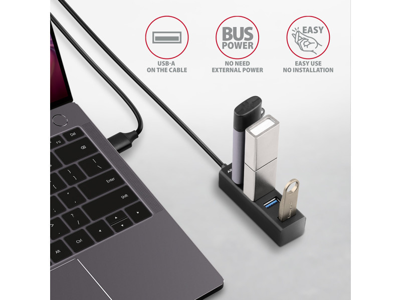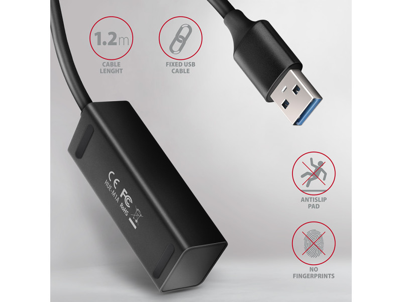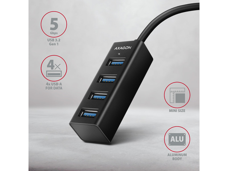 Mini fém USB 3.2 Gen 1 (USB 3.0) hub HUE-M1AL 1.2 m hosszú USB kábellel gyorsan és egyszerűen akár négy USB eszközt is csatlakoztathat számítógéphez. A fém hub test alumíniumból készült és tökéletes mechanikai védelmet. Elegáns, finom felület az ujjlenyomatok ellen. A gumipárnák megakadályozzák, hogy lecsússzanak az asztalról. A tartósan rögzített 120 cm hosszú USB-kábel asztali számítógéphez használható. Ez a kompakt hub több külső meghajtó állandó csatlakoztatását is képes kezelni. A gyors USB 3.2 Gen 1 interfésznek köszönhetően az átviteli sebesség akár 5Gb/s is lehet. A hub emellett 1.5A/5V árammal működő telefonokat és táblagépeket is tölt. Tehát a hub könnyen tölthet Android-okostelefont, Apple iPhone-t, Apple iPad-et és más készülékeket is. Bemenet: • 1x USB 3.2 Gen 1 / SuperSpeed USB portot, USB-A male csatlakozó. • Visszafelé kompatibilis az USB 3.1 Gen 1 / USB 3.0 / USB 2.0 és USB 1.1. • USB-A male (apa) típusú csatlakozó 120 cm hosszú, fixen a kábelhez rögzített. Kimenet: • 4x SuperSpeed USB portot, USB-A female csatlakozó. • Támogatja a következő átviteli sebességeket 5.000 / 480 / 12 / 1.5 Mb/s (SuperSpeed+ / High / Full / Low speed). • Az állomás teljes áteresztőképessége / átviteli sebessége az alkalmazott USB 3.2 Gen 1 interfész függvénye (elméletileg 5 Gbit/s). • Az USB hub több külső meghajtó kapcsolatát tudja kezelni egyszerre. Tulajdonságok: • Lehetőség a készülék csatlakoztatására a Hot Plug támogatásának köszönhetően. • Teljes Plug and Play támogatás. • Támogatás energiatakarékos mód. • A magas minőségű árnyékolt kábel biztosítja a gyors kommunikációs sebességet, és a minimalizálja a nemkívánatos zajt. • A fehér LED a számítógép USB portjához való csatlakozást jelzi. • Tápellátás USB-buszon keresztül (USB bus power). • Állomás 70 x 24 x 18 mm. • Súly 60 g (kábellel együtt). • 120 cm-es USB kábel. Tápellátás / Töltés: • Az USB tápellátás elegendő ahhoz, hogy mind a négy porthoz alacsony energiafogyasztású USB-eszközöket (egér, billentyűzet, kártyaolvasó, flash meghajtó stb.) vagy önálló tápellátással rendelkező készülék (nyomtató, szkenner, 3.5" külső meghajtó) csatlakozzon. • Az USB hub több külső meghajtó kapcsolatát tudja kezelni egyszerre. • Töltsön mobileszközöket (beleértve iPad-et is) 1.5A-ig terjedő árammal az egyes hub-portokban. A teljes töltési áram (amely portokra van osztva) 5V-nál eléri a 2.8A-t (a számítógép USB-portjának képességeitől függően). Támogatott operációs rendszerek: • MS Windows XP / Vista / 7 / 8 / 8.1 / 10 vagy újabb, Windows Server 2003 / 2008 / 2012 / 2016 vagy újabb (az összes 32- és 64-bites Windows rendszer támogatott), Mac OS X 10.4.x vagy újabb, Linux 2.6.x kernellel vagy afelett, a legtöbb Android verzió. Megj.: A meghajtók a támogatott operációs rendszerek részét képezik, és a telepítésük teljesen automatikus. Nincs szükség más drivert telepíteni, és el sem érhetők. A csomagolás tartalma: • SuperSpeed USB hub rögzített 120 cm-es kábellel, • nyomtatott telepítési kézikönyv CZ / DE / DK / ENG / ESP / FIN / FR / GR / HR / HU / IT / NL / PL / PT / RO / RU / SK / SWE / BG / CN / TR / ARA, • bolti állványra akasztáshoz nyílással ellátott.