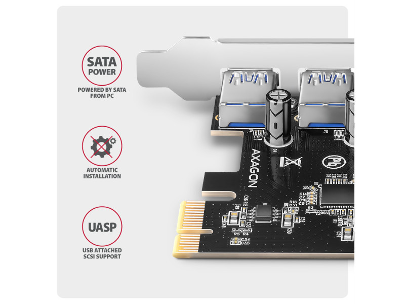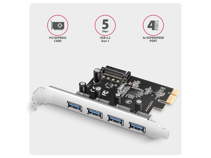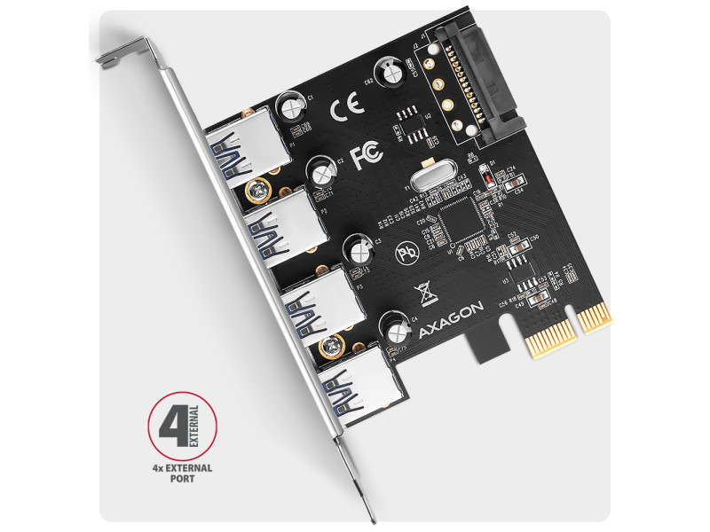 Az AXAGON PCEU-430RS PCI-Express kártya négy, külső USB-A 5Gbps porttal egészíti ki az asztali számítógépet. A kártyát gyors, akár 5 Gb/s sebességű és stabil adatátvitelre tervezték. Mind a négy USB port aljzathoz van kivezetve. Négy különböző USB-eszköz, például nyomtatók, billentyűzetek, kártyaolvasók, pendrive-ok, külső HDD-k stb. Megbízható tápellátás a PC-forrásból a SATA tápcsatlakozón keresztül. A vezérlőegység a problémamentes kompatibilitásról ismert Renesas chipsettel van ellátva és UASP-támogatás jellemez. Bemenet: • PCI-Express 2.0 interfész, PCI-Express 1.0a / 1.1 / 2.1 / 3.0 / 4.0 kompatibilis. • Az x1 / x4 / x8 / x16 PCIe sávokkal kompatibilis 1 sávos (x1) vonalak száma. • Az 1 sávos PCI-Express 2.0 busz sávszélessége akár 5 Gb/s. Bemenet (tápegység): • 15 tűs SATA hálózati csatlakozó. Kimenetek: • 4x külső USB 5Gbps port USB Type A-F csatlakozókkal. • USB 5Gbps interfézs - korábban USB 3.2 Gen 1 / USB 3.0. • Teljesen kompatibilis az USB 3.2 Gen 2, eszközök egyidejű működését USB 2.0 és USB 1.1. • Támogatja a következő átviteli sebességeket 5000 / 480 / 12 / 1.5 Mb/s. • Ha PCI-Express 1.0 verziós buszra van csatlakoztatva, az átviteli sebesség max. 2500 Mb/s. További tulajdonságok: • Teljes Plug and Play támogatás. • Támogatja az USB5Gbps, USB 2.0 és USB 1.1 eszközök egyidejű működését. • Megfelel az USB-IF végleges hivatalos xHCI specifikációjának 1.0 verziójával. • UASP (USB Attached SCSI) támogatás Windows 8-ban és újabb verziókban tnrténő gyorsabb adatátviteléhez. • Teljes mértékben támogatja az eszközök üzem közbeni USB Hot Plug csatlakoztatását és lecsatlakoztatását. • Belső SATA tápcsatlakozó a vezérlő PC tápegységről történő táplálásához. • Renesas PD720201 chipsettel. Támogatott operációs rendszerek: • MS Windows XP / Vista / 7 / 8 / 8.1 / 10 / 11, Windows Server 2003 / 2008 / 2012 / 2016 / 2019 / 2022 (az összes 32- és 64-bites Windows rendszer támogatott), Linux 2.6.31 kernellel vagy afelett. • Megjegyzés: A hardver-illesztőprogramok telepítése kizárólag a Windows XP / Vista / 7. A Windows 8 / 8.1 / 10, Server 2012 / 2016 / 2019 / 2022 és később, már nincs szükség külső meghajtók telepítésére, ezek már az operációs rendszer részét képezik. A csomagolás tartalma: • PCI-Express vezérlő szabványos hátlap, • telepítési útmutató CZ / DE / DK / ENG / ESP / EST / FIN / FR / GR / HR / HU / IT / LT / LV / NL / NOR / PL / PT / RO / SK / SLO / SRB / SWE / TR / UA / ALB / BG / BOS / CN / ARA, • kartondobozba csomagolva.
