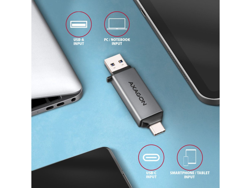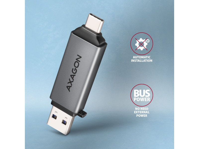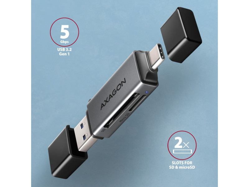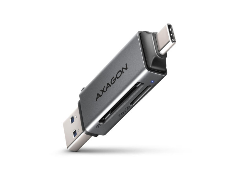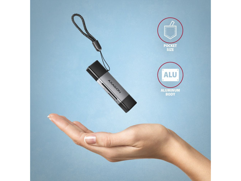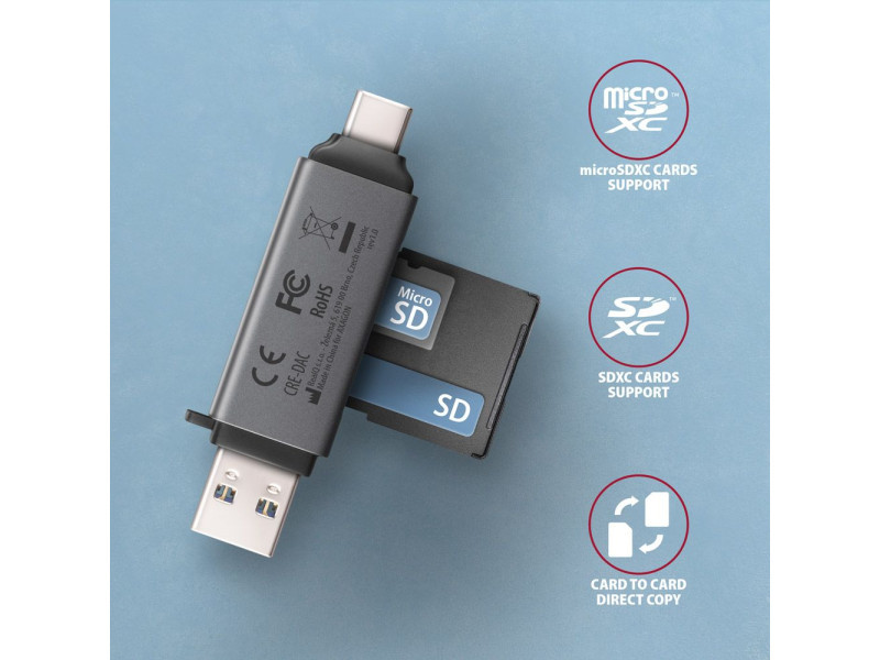 A mobil Mini memóriakártya olvasó AXAGON CRE-DAC USB 5 Gbps interfésszel támogatja az SD és microSD kártyák minden jelenlegi verzióját, beleértve az SDXC és microSDXC kártyákat is, akár 2TB kapacitással. Az olvasó nagy előnye az USB-C csatlakozó és az USB-A csatlakozó is, így a csatlakozás valóban univerzális. Az olvasó közvetlenül csatlakoztatható minden asztali számítógéphez vagy laptophoz, valamint USB-C csatlakozóval rendelkező telefonokhoz és táblagépekhez. USB 3.2 Gen 1 (USB 3.0) interfész végett a kártyaolvasó sokkal magasabb arányban olvassa az UHS-I SD kártyákat az USB 2.0 olvasókkal szemben. A kártyaolvasó lehetővé teszi a kártyák egyidejű kezelését mindkét foglalatban és a közvetlen másolást közöttük. Az olvasó fémteste nem csak jól néz ki, de a készülék még strapabíróbb lesz általa. A finoman strukturált, ujjlenyomatmentes felület szintén kiváló. Mindkét csatlakozót utazósapka védi az utazás közben. A készülék úgy lett kialakítva, hogy az a kulcscsomóra is feltehető legyen. A telepítés nagyon egyszerű, elég az olvasót a számítógép USB portjába illeszteni, és a többi művelet már teljesen automatikusan zajlik. Kártyaolvasó – két kártya hely, következő formátumokat támogatja: • Micro SD foglalat: microSD / microSDHC / microSDXC / TransFlash, • SD foglalat: Secure Digital, SDHC, SDXC, MultiMedia Card, MMC 4.0, MMC Dual Voltage, MMC Mobile, RS-MMC, miniSD, microSD, microSDHC, microSDXC, MMC Micro. Az olvasó az alábbi flash kártya specifikációkat támogatja: • SD 1.0/1.1 (SD - Secure Digital, max. 2GB). • SD 2.0 (SDHC - Secure Digital High Capacity, akár 32GB). • SD 3.0 (SDXC - Secure Digital eXtended Capacity, akár 2TB). • MMC és eMMC 3.x/4.0/4.1/4.2/4.3/4.4/4.5/5.0 (8-bit). • Támogatja az SD 3.01 és SD Jukebox alkalmazásokat (CPRM funkciók). • Ultra High Speed bus UHS-I (SDR12/SDR25/SDR50/DDR50/SDR104) támogatás, sebesség akár 104 MB/s. • ECC (Error Correction Code) funkció és CRC (Cyclic Redundancy Check) funkció támogatása. • 2 LUN - a fájlkezelőkben az olvasó egyetlen lemezegységként jelenik meg. • FAT 12/16/32, NTFS, exFAT (FAT 64) fájlformátum támogatás. További tulajdonságok: • SuperSpeed USB - USB 3.2 Gen 1 interfész (előzőleg USB 3.1 Gen 1 / USB 3.0). • Kompatibilis továbbá USB 3.2 Gen 2 interfésszel, visszafele USB 2.0 és USB 1.1 kompatibilis. • Támogatja a 1.5 / 12 / 480 / 5000 Mbit/s (low / full / high / super speed) átviteli sebességet. • Teljes Plug and Play és Hot Swap támogatás. • USB-C apa vagy USB-A apa csatlakozóval csatlakoztatható. • Támogatja a telefonos microUSB csatlakoztatást OTG adapterrel. • Olvasó teljesítmény USB-buszon keresztül (bus-power). • A LED dióda jelzi az olvasó és a számítógép csatlakoztatását. • 70 x 17 x 10 mm méret kupakkal együtt. • Súly 14 g. Támogatott operációs rendszerek: • MS Windows 7 / 8 / 8.1 / 10 / 11 vagy újabb, Windows Server 2008 / 2012 / 2016 / 2019 / 2022 és újabb (32- és 64-bites Windows verzió támogatás), Mac OS X 10.x és újabb, Linux 2.4.x és újabb, Android összes verzió. • Megjegyzés: Az illesztőprogramok az operációs rendszerekben megtalálhatók, és teljesen automatikusan telepítésre kerülnek. Nincs szükség más drivert telepíteni, és el sem érhetők. A csomagolás tartalma: • SuperSpeed USB kártyaolvasó, • 2 USB csatlakozó kupak, • kulcscsomóra helyezhető, • telepítési útmutató CZ / DE / DK / ENG / ESP / FIN / FR / GR / HR / HU / IT / NL / PL / PT / RO / RU / SK / SWE / BG / CN / TR / ARA, • bolti állványra akasztáshoz nyílással ellátott.