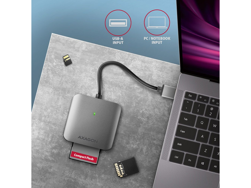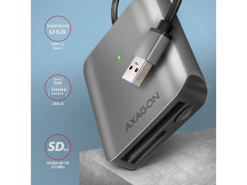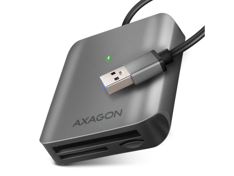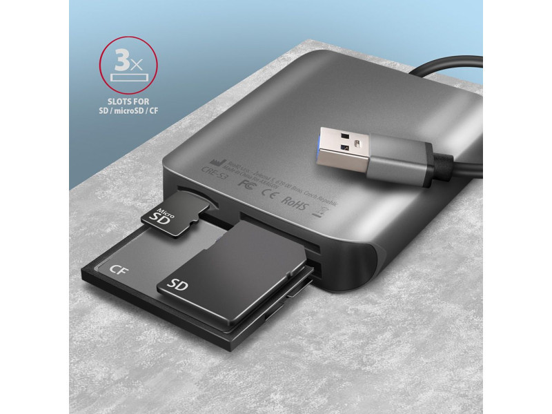Az alumínium 3in1 memóriakártya-olvasó AXAGON CRE-S3 SUPERSPEED USB 3.2 Gen 1 interfésszel támogatja az SD és microSD kártyák minden jelenlegi verzióját, beleértve az SDXC és microSDXC kártyákat is, akár 2TB kapacitással. Támogatja a legfeljebb 128PT kapacitású CF-kártyákat is. Az USB 3.2 Gen 1 (USB 3.0) segítségével a kártyaolvasó az USB 2.0 interfészes olvasókkal szemben jelentősen magasabb adatátviteli sebességet ér el. Az UHS-II kártyák akár 156 MB/s (full-duplex) vagy 312 MB/s (half-duplex) sebességet is elérhetnek, a régebbi USH-I kártyák (maximális sebesség 104 MB/s) támogatása magától értetődő. Az olvasó az összes kártyahelyen lévő kártyákkal való egyidejű munka és a közöttük történő közvetlen másolás lehetőségével fog tetszeni önnek. Az olvasó elegáns alumínium teste puha felülettel rendelkezik az ujjlenyomatok csökkentése érdekében. A telepítés nagyon egyszerű - elég az olvasót a számítógép USB portjába illeszteni, és a többi művelet már teljesen automatikusan zajlik. Az olvasó ideális kiegészítő a modern UHS-II és CF-kártyákat használó photó amatőrök és profik számára. Kártyaolvasó – három kártya hely, következő formátumokat támogatja: • Micro SD foglalat: microSD, microSDHC, microSDXC, TransFlash. • SD foglalat: Secure Digital, SDHC, SDXC, MultiMedia Card, MMC 4.0, MMC Dual Voltage, MMC mobile, RS-MMC, miniSD, MMC Micro adapter. • CF foglalat: Compact Flash, CF Type I. Az olvasó az alábbi flash kártya specifikációkat támogatja: • SD 1.0/1.1 (SD - Secure Digital, max. 2GB). • SD 2.0 (SDHC - Secure Digital High Capacity, akár 32GB). • SD 3.0 (SDXC - Secure Digital eXtended Capacity, akár 2TB). • SD 4.0 (SDXC - Secure Digital eXtended Capacity, akár 2TB). • MMC és eMMC 3.x/4.0/4.1/4.2/4.3/4.4/4.5/5.0 (8-bit). • CF 6.0 (UDMA 0 - UDMA 7, akár 128PB). • Támogatja az SD 3.01 és SD Jukebox alkalmazásokat (CPRM funkciók). • Támogatja az Ultra High Speed busz UHS-II (FD156/HD312) sebességét, akár 156 MB/s Full Duplex, illetve 312 MB/s Half Duplex sebességgel. • Ultra High Speed UHS-I támogatás (SDR12/SDR25/SDR50/DDR50/SDR104) akár 104 MB/s sebességig. • ECC (Error Correction Code) funkció és CRC (Cyclic Redundancy Check) funkció támogatása. • 3 LUN – fájlkezelőkben az olvasó három külön lemezként jelenik meg. • FAT 12/16/32, NTFS, exFAT (FAT 64) fájlformátum támogatás. További tulajdonságok: • SuperSpeed USB - USB 3.2 Gen 1 interfész (előzőleg USB 3.1 Gen 1 / USB 3.0). • Kompatibilis továbbá USB 3.2 Gen 2 interfésszel, visszafele USB 2.0 és USB 1.1 kompatibilis. • Támogatja a 5000 / 480 / 12 Mb/s (Superspeed / High / Full speed) átviteli sebességet. • Teljes Plug and Play és Hot Swap támogatás. • USB-A apa csatlakozóval csatlakoztatható. • Támogatja a telefonos microUSB csatlakoztatást OTG adapterrel. • USB-C csatlakozóval rendelkező telefonok csatlakoztatásának támogatása USB-C <-> USB-A adapter használatával. • USB-busz kártyaolvasó tápforrás (bus-power). • Zöld LED, amely jelzi a számítógép USB-portjához való csatlakozást (állandó fény) és az adatátvitelt (villog). • Méretei 64 x 60 x 15 mm, a rögzített kábel hossza 15 cm. • Súly 53 g. Támogatott operációs rendszerek: • MS Windows 7 / 8 / 8.1 / 10 / 11 vagy újabb, Windows Server 2008 / 2012 / 2016 / 2019 / 2022 és újabb (32- és 64-bites Windows verzió támogatás), Mac OS X 10.x és újabb, Linux 2.4.x és újabb, Android összes verzió. • Megjegyzés: Az illesztőprogramokat az operációs rendszer tartalmazza, ezek automatikusan telepítésre kerülnek. Nincs szükség más drivert telepíteni, és el sem érhetők. A csomagolás tartalma: • SuperSpeed USB kártyaolvasó, • telepítési útmutató CZ / DE / DK / ENG / ESP / FIN / FR / GR / HR / HU / IT / NL / PL / PT / RO / RU / SK / SWE / BG / CN / TR / ARA, • bolti állványra akasztáshoz nyílással ellátott.