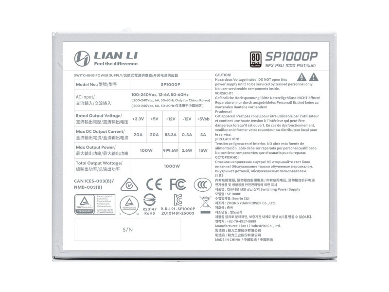 A Lian Li SP Platinum 1 000W tápegység tökéletesen felkészült a modern gamer hardverekre. Ez a kompakt tápegység akár 1 000 watt teljesítményt nyújt, és könnyedén támogatja a csúcskategóriás Intel vagy AMD CPU-kat, valamint az olyan videokártyákat, mint az RTX 5070 Ti. A helytakarékos SFX forma faktornak és a mellékelt ATX konzolnak köszönhetően szinte bármilyen házba beszerelhető – Mini-ITX-től Full Tower-ig. Félterhelésnél akár 92%-os hatékonyságával megfelel a 80 PLUS Platinum tanúsításnak. Ez áramot takarít meg, és halk hűtést biztosít a 92 mm-es ventilátor Zero-RPM módjával. Kompakt SFX forma faktor: ATX konzollal szélesebb házkompatibilitásért 1 000 watt teljesítmény: ideális nagy teljesítményű gamer rendszerekhez 80 PLUS Platinum hatékonyság: akár 92% félterhelésnél Teljesen moduláris: teljes harisnyázott kábelkészlettel ATX 3.1 & PCIe 5.1 szabvány: jövőbiztos 12V 2x6 csatlakozóval Halk hűtés: 92 mm-es FDB ventilátor Zero-RPM móddal Kompakt és rugalmasan használható A Lian Li SP Platinum lenyűgöző kompakt kialakításával – mindössze 125 x 100 x 63,5 mm-es méretével – egyszerűen elfér a kis SFX házakban, a mellékelt konzollal pedig ATX házakban is alkalmazható. Tökéletes olyan build-ekhez, ahol a hely és a teljesítmény egyaránt fontos. Erőteljes a modern hardverekhez Akár 1 000 watt teljesítménnyel a tápegység ideálisan alkalmas a jelenlegi csúcskategóriás komponensekhez. Elegendő energiát biztosít a legújabb generációs processzorok és videokártyák számára, miközben még tartalékot is hagy a meghajtók, perifériák és hűtőrendszerek számára. Magas energiahatékonyság A japán Rubycon kondenzátoroknak köszönhetően az SP Platinum különösen hatékony energiaellátást valósít meg. Félterhelésnél a fogyasztott energia akár 92%-a használható energiává alakul. Az eredmény: 80 PLUS Platinum tanúsítás a legmagasabb hatékonyságért és alacsony hőtermelésért. Kiváló minőségű, moduláris kábelek A Lian Li SP Platinum teljesen moduláris kialakítással rendelkezik – maximális rugalmasságért és letisztult megjelenésért. Valamennyi harisnyázott kábel rugalmas és könnyen elvezethető. A különleges 12V 2x6 csatlakozó kétszínű jelölése biztos kapcsolatot garantál. Ezen kívül egy C14-C13 hosszabbító kábel integrált bekapcsolóval is tartozik a csomaghoz. Ezzel kényelmesen ki tudod kapcsolni a PC tápellátását – még akkor is, ha a tápegység mélyen a ház belsejében helyezkedik el. Biztonságos és tartós A tápegység átfogó védelmi funkciókkal rendelkezik, mint például túláram-, túlfeszültség-, túlterhelés- és rövidzárvédelem. Ez hosszú távon biztonságban tartja a hardvered. A kiváló minőségű alkatrészeknek és a precíz gyártásnak köszönhetően az SP Platinum hosszú élettartamra készült – megbízható alapot biztosítva a rendszerednek. Műszaki adatok Szín Alapszín: fehér Méretek Hossz / mélység: 125 mm Szélesség: 63,5 mm Magasság: 100 mm Ventilátor specifikációk Ventilátorméret: 92 mm Tápegység Tápegység formátum: SFX ATX szabvány: ATX 3.1 Moduláris tápegység: igen Moduláris kivitel: teljesen moduláris Védelmi funkciók OCP (túláram), OPP (túlterhelés), OTP (túlmelegedés), OVP (túlfeszültség és alulfeszültség), SCP (rövidzár), UVP (alulfeszültség) Teljesítmény adatok Teljes kimeneti teljesítmény: 1 000 W +3,3 V & +5 V (együtt): 100 W +12 V ág(ak): 999,6 W Kábel specifikációk Maximális CPU tápkábel hossz: 450 mm Maximális 24-pines alaplapi tápkábel hossz: 350 mm Maximális 12V-2x6 kábelhossz: 400 mm Maximális PCIe tápkábel hossz: 550 mm Maximális SATA tápkábel hossz: 600 mm Hűtés Félig passzív tápegység: igen Belső csatlakozók CPU 12 V ATX/EPS csatlakozók: 2 CPU tápcsatlakozás: 2× 4+4-pines 12V-2x6 tápcsatlakozók: 1 6+2-pines PCIe csatlakozók: 3 SATA csatlakozók: 5 Külső csatlakozók USB hub: nincs Hatásfok 80 PLUS minősítés: 80 PLUS Platinum Világítás Világítás / RGB: nincs