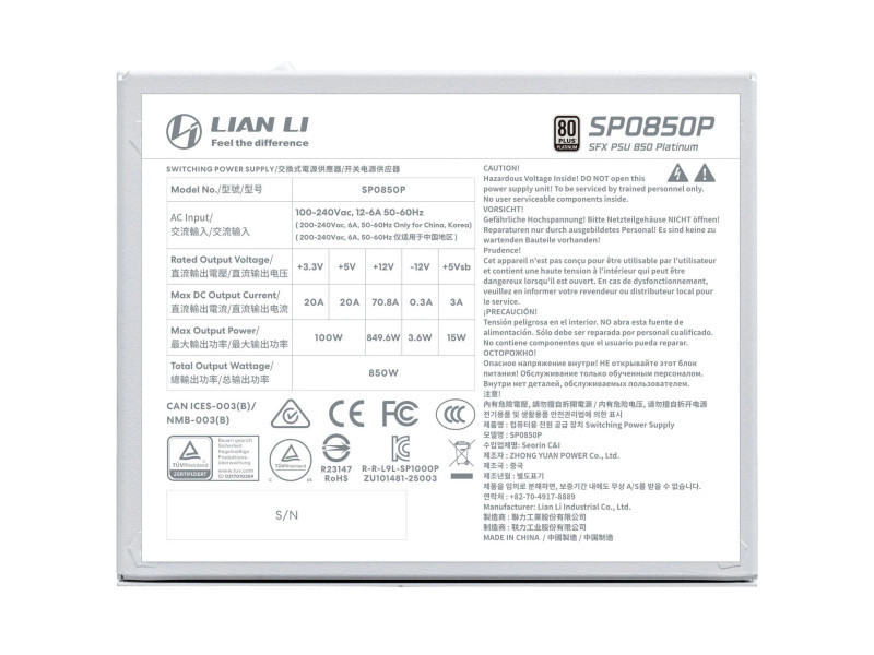 A Lian Li SP Platinum 850W tápegység tökéletesen felkészült a modern gamer hardverekre. Ez a kompakt tápegység akár 850 watt teljesítményt nyújt, és könnyedén támogatja a csúcskategóriás Intel vagy AMD CPU-kat, valamint az olyan videokártyákat, mint az RTX 5070 Ti. A helytakarékos SFX forma faktornak és a mellékelt ATX konzolnak köszönhetően szinte bármilyen házba beszerelhető – Mini-ITX-től Full Tower-ig. Félterhelésnél akár 92%-os hatékonyságával megfelel a 80 PLUS Platinum tanúsításnak. Ez áramot takarít meg, és halk hűtést biztosít a 92 mm-es ventilátor Zero-RPM módjával. Kompakt SFX forma faktor: ATX konzollal szélesebb házkompatibilitásért 850 watt teljesítmény: ideális nagy teljesítményű gamer rendszerekhez 80 PLUS Platinum hatékonyság: akár 92% félterhelésnél Teljesen moduláris: teljes harisnyázott kábelkészlettel ATX 3.1 & PCIe 5.1 szabvány: jövőbiztos 12V 2x6 csatlakozóval Halk hűtés: 92 mm-es FDB ventilátor Zero-RPM móddal Kompakt és rugalmasan használható A Lian Li SP Platinum lenyűgöző kompakt kialakításával – mindössze 125 x 100 x 63,5 mm-es méretével – egyszerűen elfér a kis SFX házakban, a mellékelt konzollal pedig ATX házakban is alkalmazható. Tökéletes olyan build-ekhez, ahol a hely és a teljesítmény egyaránt fontos. Erőteljes a modern hardverekhez Akár 850 watt teljesítménnyel a tápegység ideálisan alkalmas a jelenlegi csúcskategóriás komponensekhez. Elegendő energiát biztosít a legújabb generációs processzorok és videokártyák számára, miközben még tartalékot is hagy a meghajtók, perifériák és hűtőrendszerek számára. Magas energiahatékonyság A japán Rubycon kondenzátoroknak köszönhetően az SP Platinum különösen hatékony energiaellátást valósít meg. Félterhelésnél a fogyasztott energia akár 92%-a használható energiává alakul. Az eredmény: 80 PLUS Platinum tanúsítás a legmagasabb hatékonyságért és alacsony hőtermelésért. Kiváló minőségű, moduláris kábelek A Lian Li SP Platinum teljesen moduláris kialakítással rendelkezik – maximális rugalmasságért és letisztult megjelenésért. Valamennyi harisnyázott kábel rugalmas és könnyen elvezethető. A különleges 12V 2x6 csatlakozó kétszínű jelölése biztos kapcsolatot garantál. Ezen kívül egy C14-C13 hosszabbító kábel integrált bekapcsolóval is tartozik a csomaghoz. Ezzel kényelmesen ki tudod kapcsolni a PC tápellátását – még akkor is, ha a tápegység mélyen a ház belsejében helyezkedik el. Biztonságos és tartós A tápegység átfogó védelmi funkciókkal rendelkezik, mint például túláram-, túlfeszültség-, túlterhelés- és rövidzárvédelem. Ez hosszú távon biztonságban tartja a hardvered. A kiváló minőségű alkatrészeknek és a precíz gyártásnak köszönhetően az SP Platinum hosszú élettartamra készült – megbízható alapot biztosítva a rendszerednek. Műszaki adatok Szín Alapszín: fehér Méretek Hossz / mélység: 125 mm Szélesség: 63,5 mm Magasság: 100 mm Ventilátor specifikációk Ventilátorméret: 92 mm Tápegység Tápegység formátum: SFX ATX szabvány: ATX 3.1 Moduláris tápegység: igen Védelmi funkciók: OCP (túláram), OPP (túlterhelés), OTP (túlmelegedés), OVP (túlfeszültség és alulfeszültség), SCP (rövidzár), UVP (alulfeszültség) Teljesítmény adatok Teljes kimeneti teljesítmény: 850 W +3,3 V & +5 V (együtt): 100 W +12 V ág(ak): 849,6 W Kábel specifikációk Maximális CPU tápkábel hossz: 450 mm Maximális 24-pines alaplapi tápkábel hossz: 350 mm Maximális 12V-2x6 kábelhossz: 400 mm Maximális PCIe tápkábel hossz: 550 mm Maximális SATA tápkábel hossz: 600 mm Hűtés Félig passzív tápegység: igen Belső csatlakozók CPU 12 V ATX/EPS csatlakozók: 2 CPU tápcsatlakozás: 2× 4+4-pines 12V-2x6 tápcsatlakozók: 1 6+2-pines PCIe csatlakozók: 3 SATA csatlakozók: 5 Hatásfok 80 PLUS minősítés: 80 PLUS Platinum Világítás Világítás / RGB: nincs