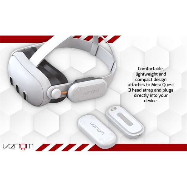 • Könnyű, kompakt kialakítás, amely egyszerűen rögzíthető a Meta Quest 3 fejhallgató pántjához, és közvetlenül az eszköz töltőportjához csatlakoztatható