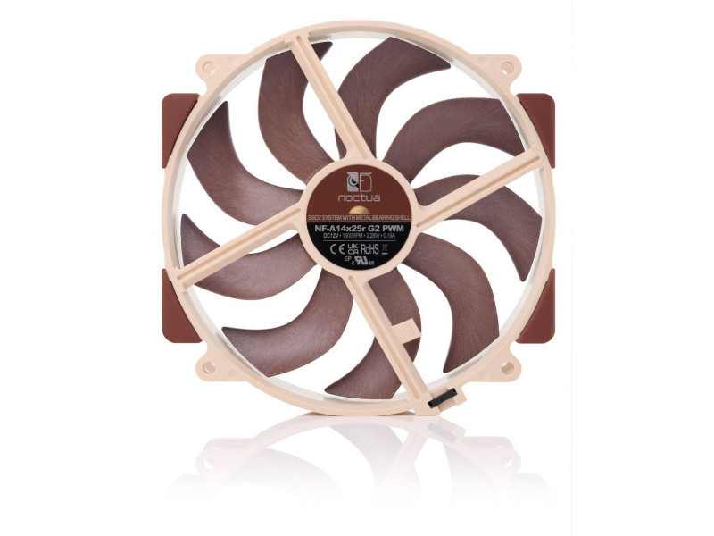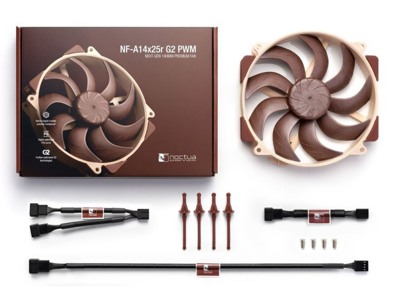 A Noctua NF-A14x25r G2 az alacsony zajszintű, prémium minőségű, 140 mm-es kerek keretes ventilátor, amely a díjnyertes NF-A15 és a forradalmi NF-A12x25 modellek örökségére építve a következő generációs termék. A Sterrox® LCP anyag, az optimalizált Progressive-Bend lapát, a Flow Acceleration Channels (Áramlásgyorsító csatornák) és a Centrifugal Turbulator központi csapágy egyesítésével, mindössze 0,7 mm-es hézaggal, a NF-A14x25r G2 tovább javítja elődje csendes hűtési teljesítményét. Ez nemcsak tökéletes választás a Noctua következő generációs 140 mm-es hűtőbordáihoz, hanem kiváló frissítés a már meglévő hűtőmodellekhez, mint például az NH-D15(S) vagy NH-U14S sorozat (Sx2-PP készlet javasolt push/pull konfigurációkhoz).