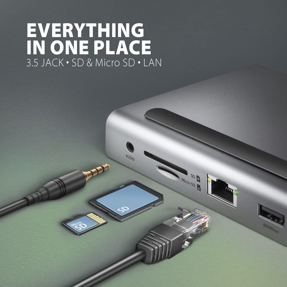 Axagon HMC-4KX3 USB-C hub, 11 az 1-ben, három 4K kijelző, Gigabit Ethernet, PD 100W