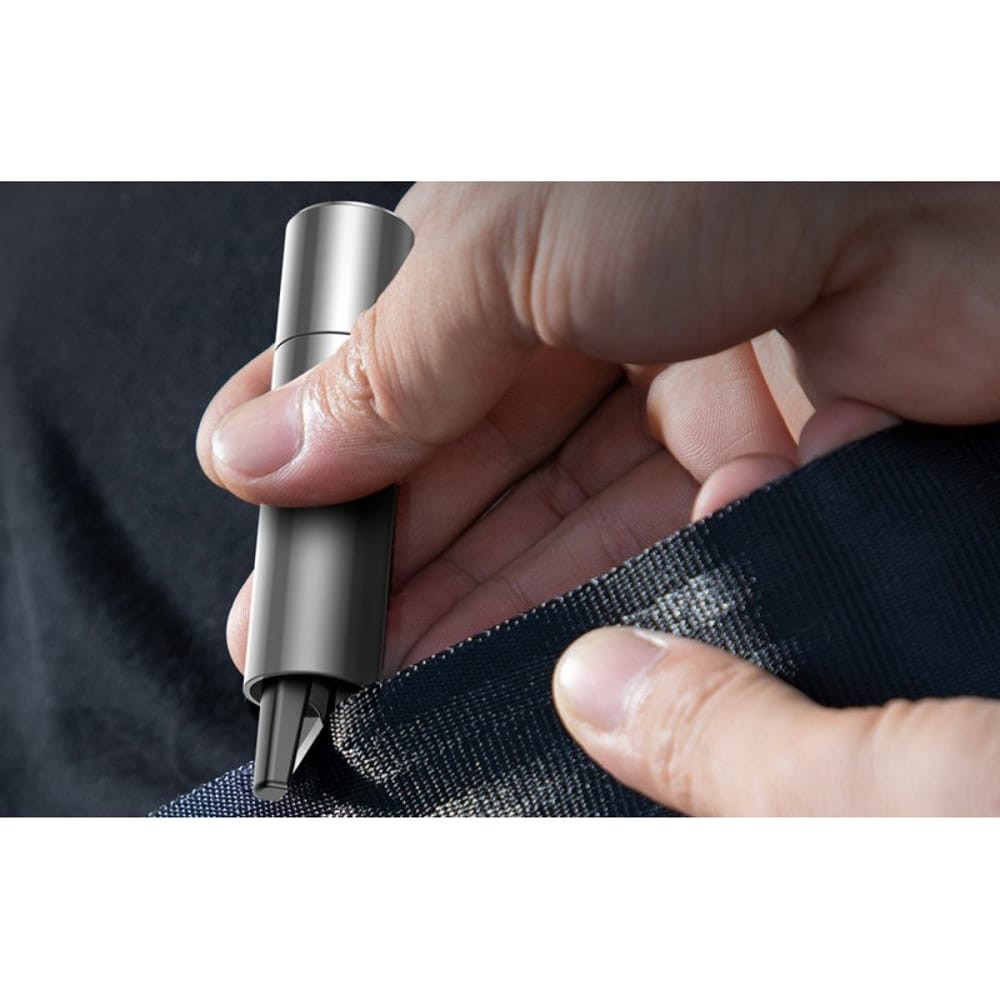 • Vészhelyzeti üvegtörő: A beépített rugós mechanizmus és az edzett acél hegy lehetővé teszi az autó ablakának gyors betörését vészhelyzetben, például baleset, tűz vagy vízbe esés esetén.
