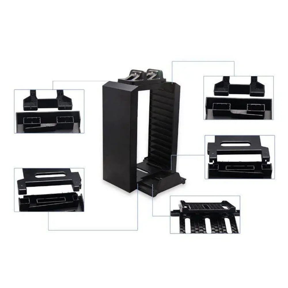 FroggieX PlayStation 4 töltő és lemeztároló torony, 2 kontroller töltés, 12 lemezes tároló, fekete - FX-P4-C1-B