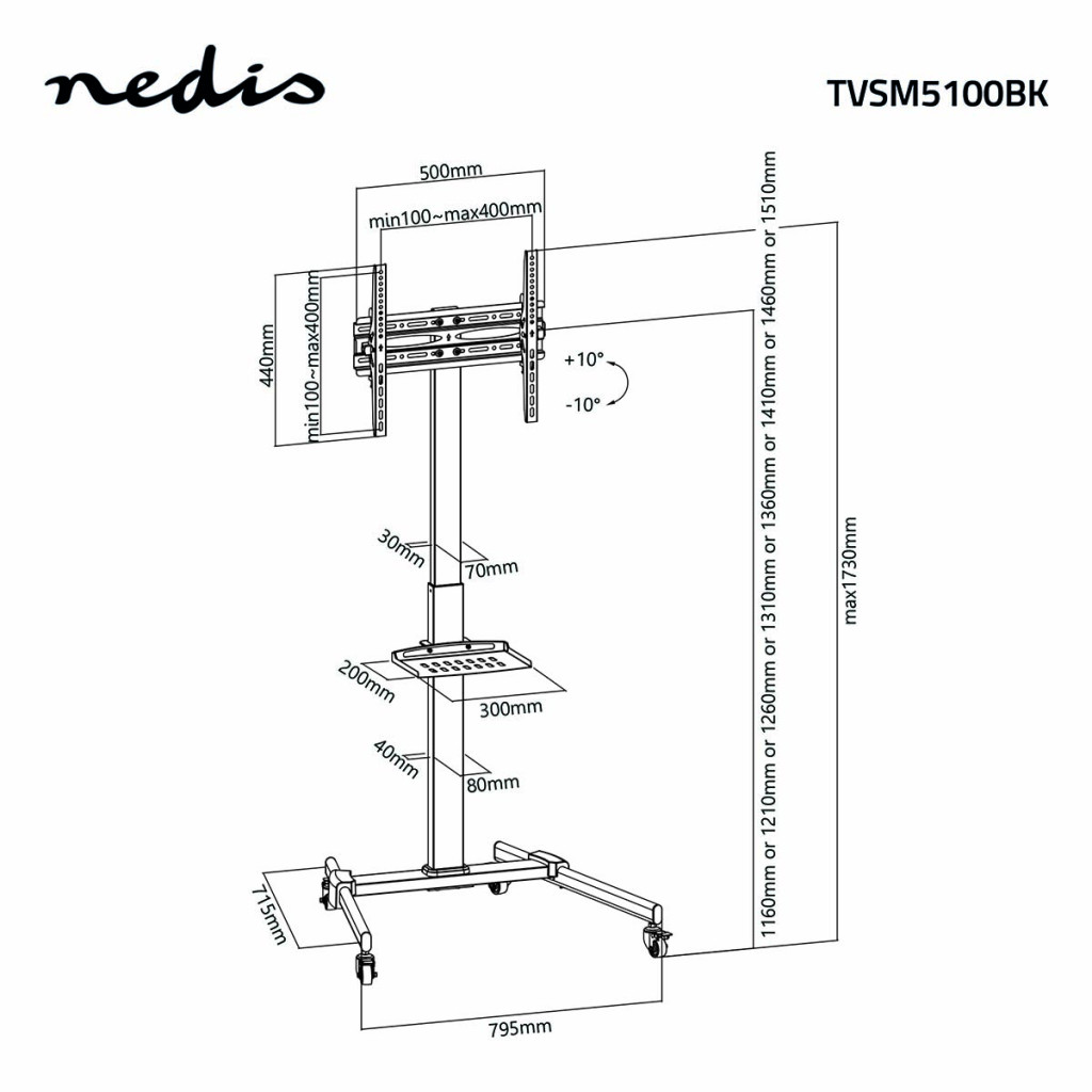A Nedis TVSM5100BK padlóállvány kiváló választás üzletekbe, tantermekbe, előadótermekbe vagy akár otthoni használatra is. A 32–55" méretű tévékhez tervezett állvány erős acélszerkezete 35 kg-ig terhelhető. A teleszkópos oszlop 8 magasságállítási lehetőséget kínál (1160–1510 mm között), melyeket a gyorskioldós rugós zár segítségével lehet rögzíteni. A +10°~-10° dönthetőség, a szintezhető szerkezet, valamint a kábelszervező rendszer biztosítják a kényelmet és a rendezettséget. Az állvány tartalmaz egy állítható magasságú kiegészítő polcot is, akár 5 kg teherbírással, ideális DVD lejátszóhoz vagy egyéb tartozékokhoz. A 4 fékezhető görgővel egyszerűen mozgatható és stabilizálható a kívánt helyen.