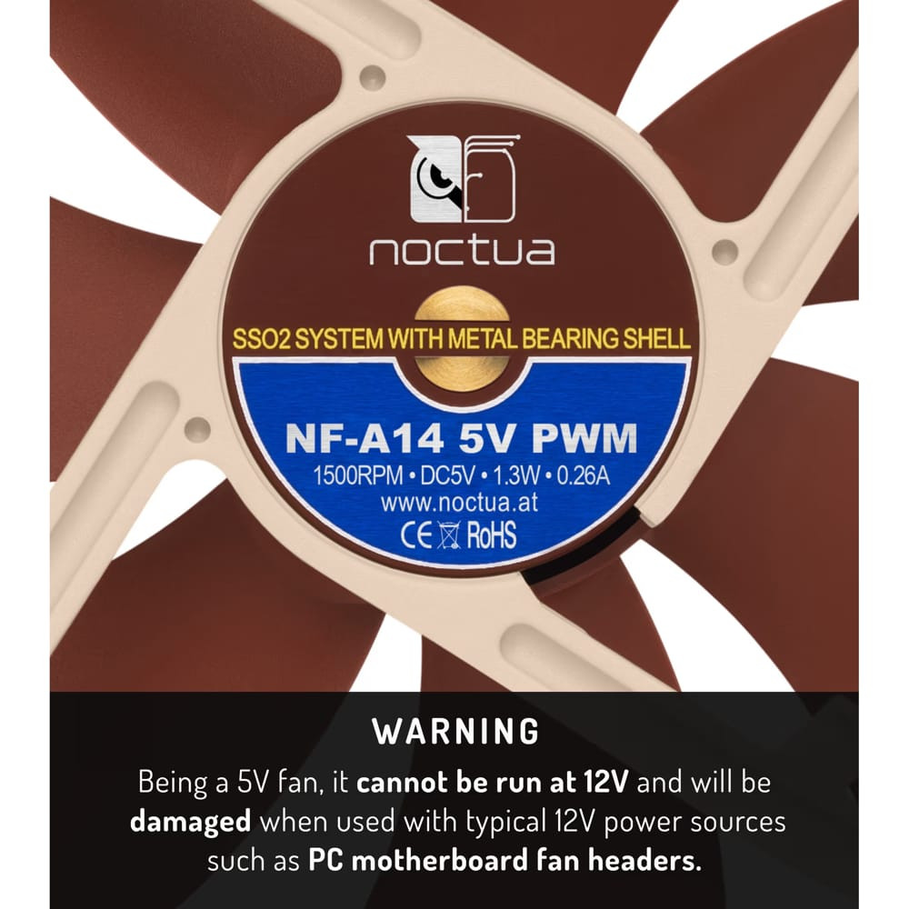 A Noctua NF-A14 5V PWM a díjnyertes NF-A14 ventilátor 5 V-os, PWM vezérlésű változata, amelyet kifejezetten olyan alkalmazásokhoz terveztek, ahol a szabványos 12 V-os ventilátorok nem használhatók. A fejlett aerodinamikai kialakítás, az AAO szabványú keret és a kiváló minőségű alkatrészek biztosítják a magas teljesítményt és az extrém csendes működést.